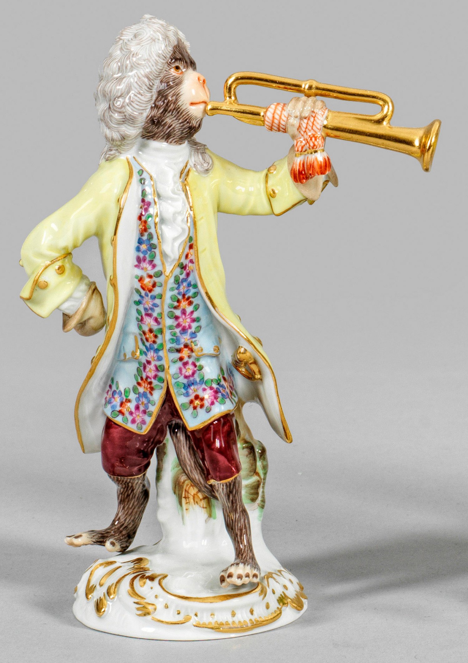 Auf rocaillereliefiertem Sockel stehender Affe als Musikant, in der linken Hand eine vergoldete Trompete haltend. Polychrome Malerei mit Goldstaffage. Entw. Johann Joachim Kaendler und Peter Reinicke. Modell-Nr. 60005. Schwertermarke. H. 13 cm.