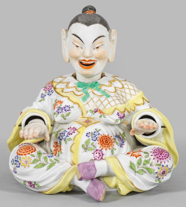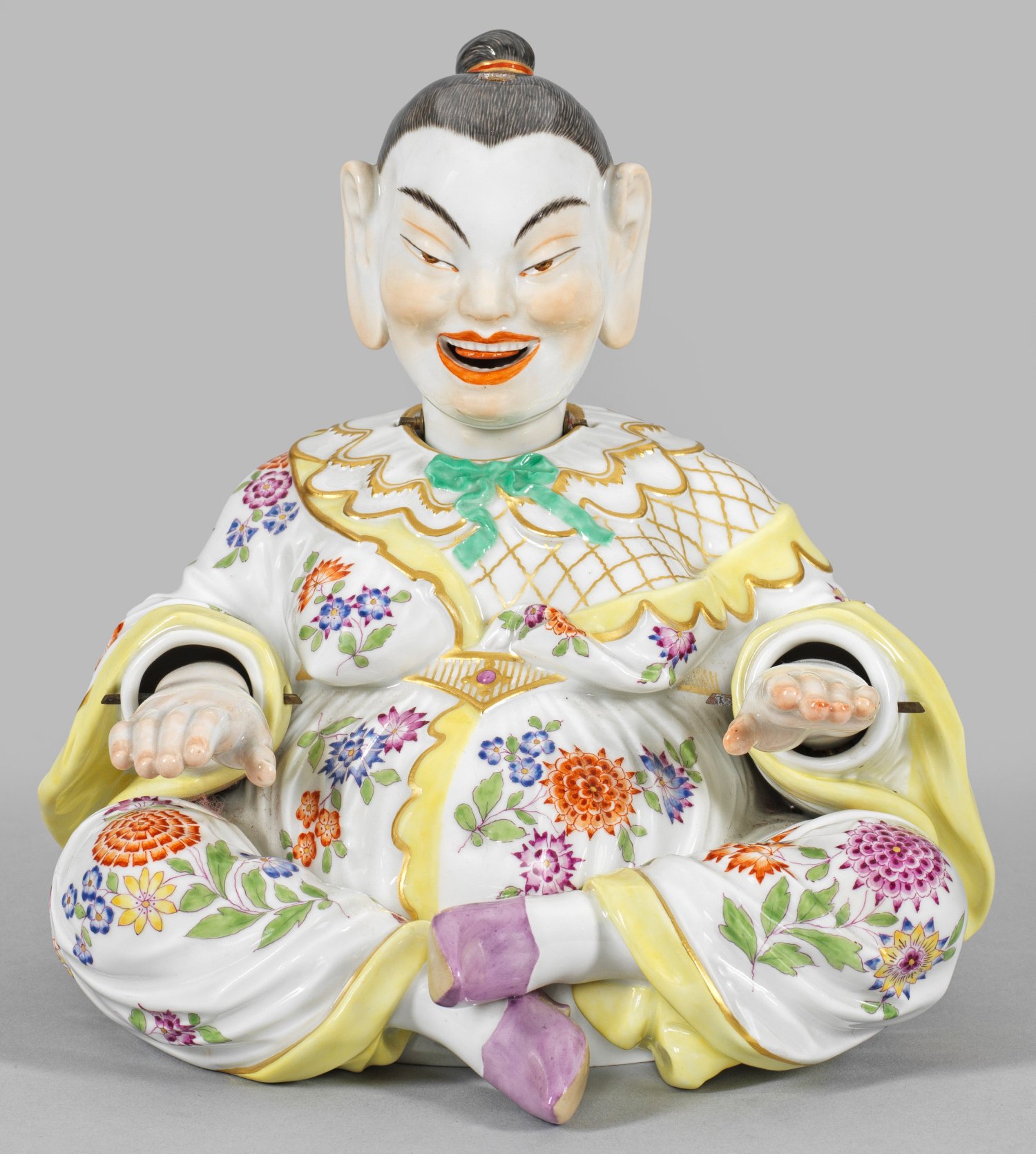 Mit verschränkten Beinen sitzende, dickbäuchige Chinesin in einem weißen, von großen Indianischen Blüten gemusterten Gewand mit gelbem Innenfutter, goldornamentiertem Gürtel, spitzengesäumtem, weißem Kragen sowie rosafarbenen Pantoffeln. Der halbnackte Oberkörper von einem Goldnetz bedeckt. Hände, Kopf und Zunge beweglich. Polychrome Malerei mit Goldstaffage. Entw. Johann Joachim Kaendler. Modell-Nr. 157. Jahreszeichen. Schwertermarke. H. 18 cm.
