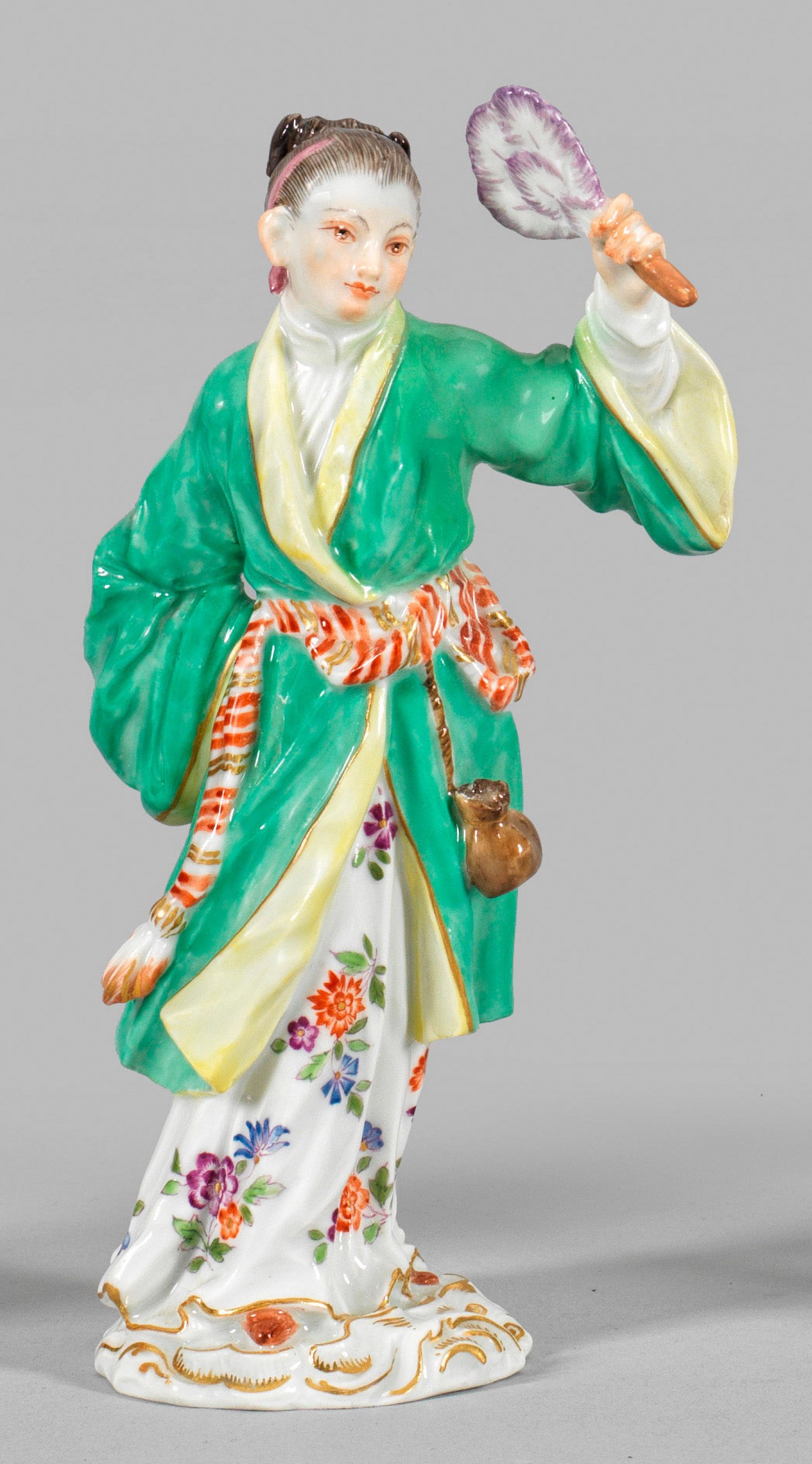 Auf rocaillereliefiertem Sockel stehende junge Japanerin im langen, blütengemusterten Gewand und seegrünen, gegürteten Mantel, in ihrer linken, erhobenen Hand einen Fächer haltend. Polychrome Malerei mit Goldstaffage. Entw. Johann Joachim Kaendler. Modell-Nr. 2671. Minim. rest.; Schwertermarke. H. 16 cm.