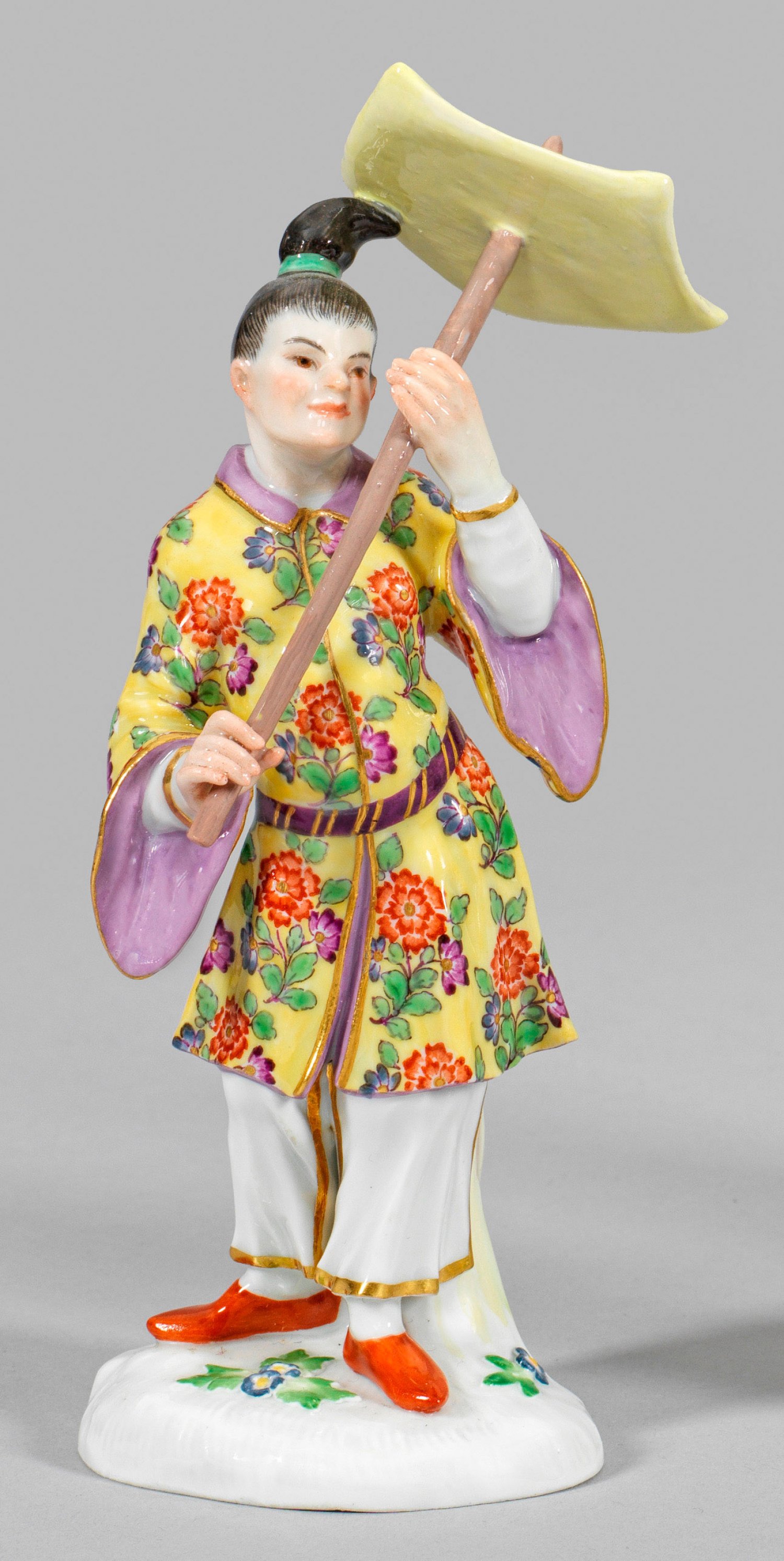 Auf stilisiertem Grassockel stehender Japaner mit gelbem, von Indianischen Blumen gemustertem Gewand über weißer Hose, in beiden Händen einen aufgespannten Sonnenschirm haltend. Polychrome Malerei mit Gold. Entw. Peter Reinicke. Modell-Nr. 421. Unw. rest.; Schwertermarke. H. 17,5 cm.
