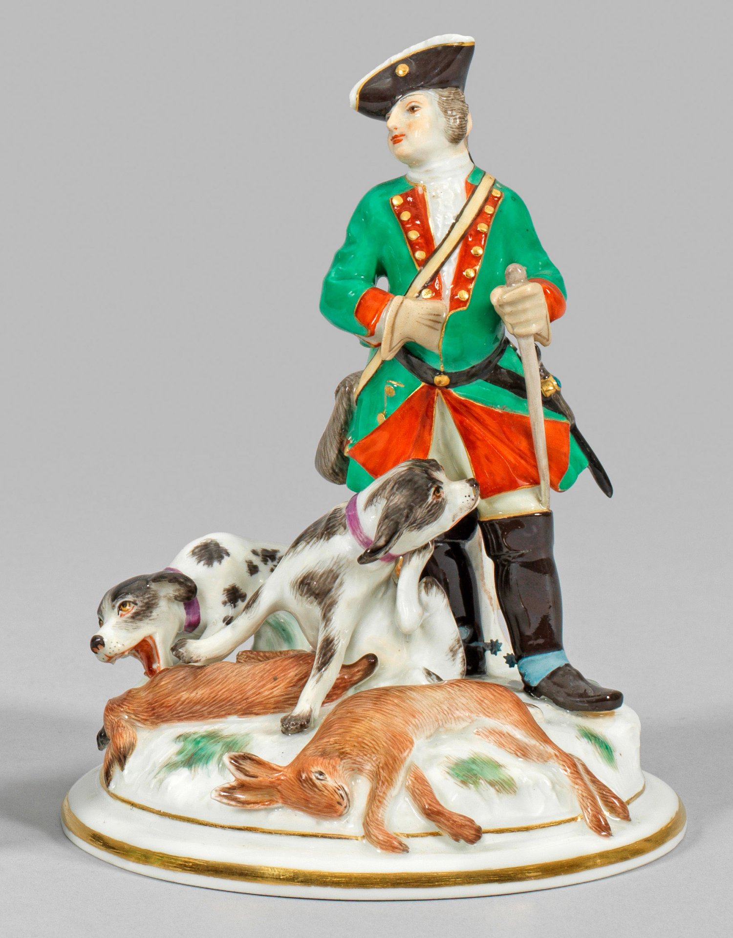 Auf gewölbtem, naturalistisch gestaltetem Terrainsockel stehender Jäger. Zu seinen Füßen sitzende Jagdhunde mit der erlegten Beute. Polychrome Malerei mit dezenter Goldstaffage. Entw. Johann Friedrich Eberlein. Modell-Nr. 222. Schwertermarke. H. 15,5 cm.