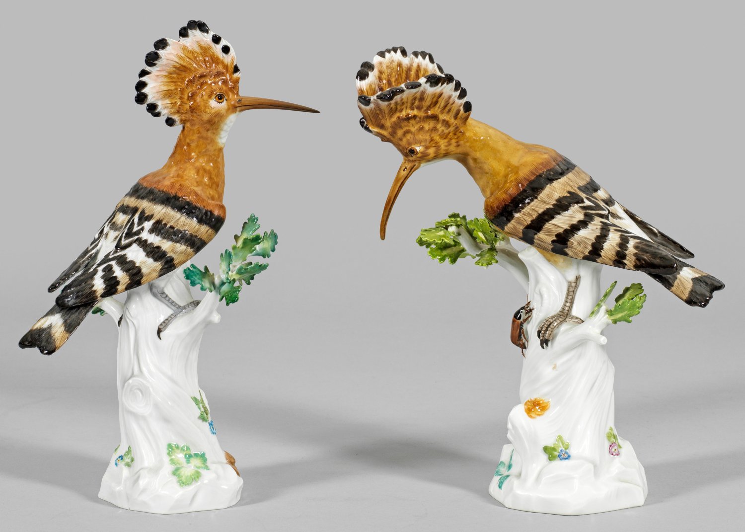 Hoher Baumstammsockel mit emporragenden Eichenblättern, belegt mit plastischen Blüten und Blättern sowie teilw. einem Käfer. Sitzender Wiedehopf mit fein reliefiertem, in Brauntönen staffiertem Gefieder, schwarz-weiß gebänderten Flügeln, einer akzentuierten, aufgerichteten Federhaube sowie einem langen, gebogenen, spitzen Schnabel. Polychrome Malerei. Entw. Johann Joachim Kaendler und Johann Gottlieb Eder. Modell-Nr. 278 und 282. Unw. rest.; Schwertermarke. H. 30,5 cm - 32,5 cm.
