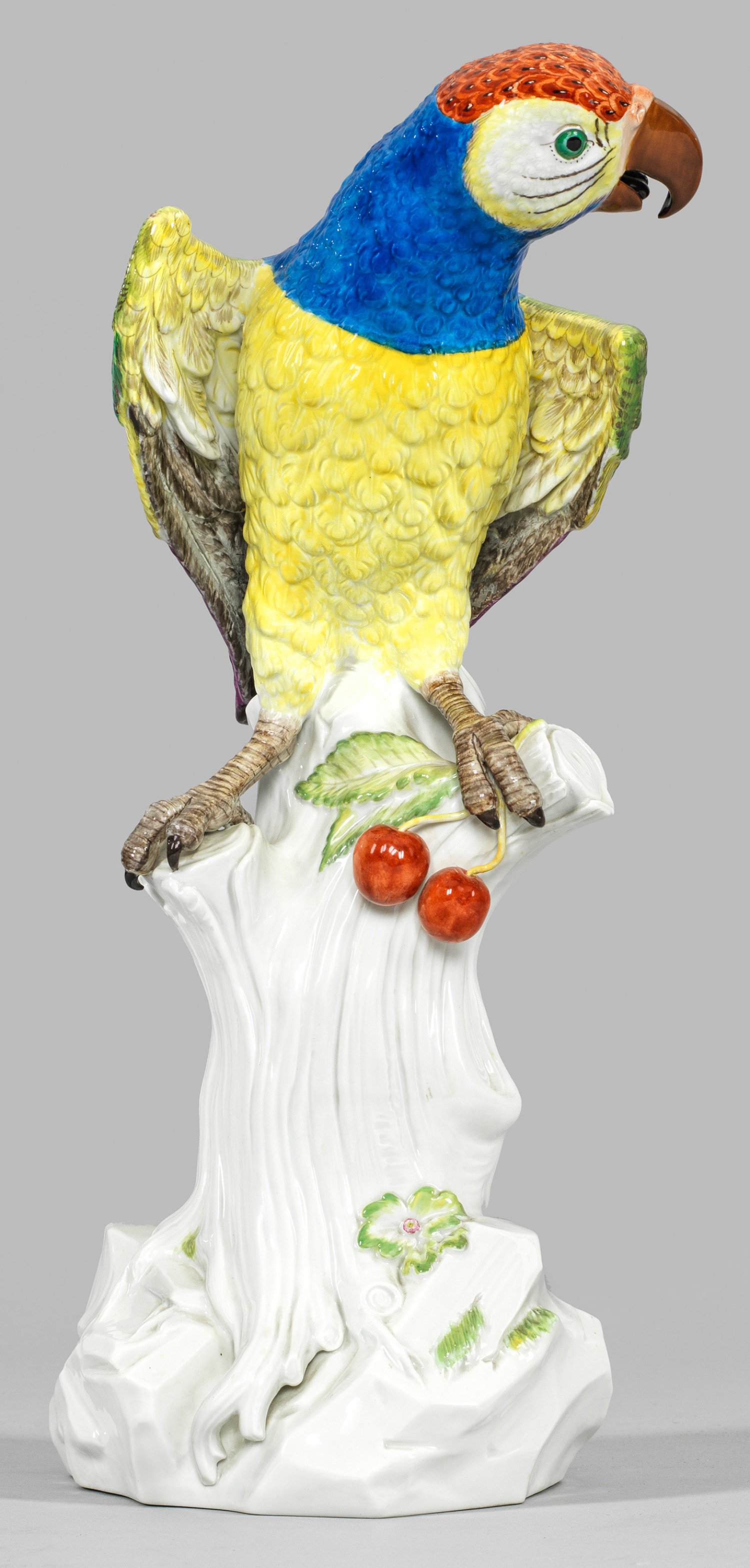Über kräftigem Felssockel emporragender, mit plastischen Blüten und Blättern sowie Kirschenzweig belegter Baumstamm. Darauf sitzender Papagei mit fein reliefiertem, in prächtigen, leuchtenden Farben staffiertem Federkleid, den Kopf nach links geneigt. Polychrome Malerei. Entw. Johann Joachim Kaendler. Modell-Nr. 77234. Rest.; Schwertermarke. H. 43 cm.
