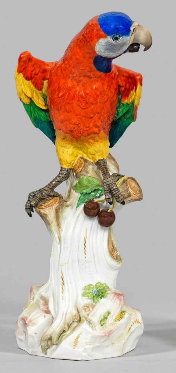 Über dezent staffiertem Felssockel emporragender, mit plastischen Blüten und Blättern sowie Kirschenzweig belegter Baumstamm. Darauf sitzender, den Kopf nach links neigender Papagei mit fein reliefiertem Federkleid, staffiert in kräftig leuchtendem Rot, Blau und Gelb. Schnabel, Krallen und teilw. das Haupt in Grau- und Brauntönen mit Schwarz. Polychrome Malerei mit sparsamer Goldakzentuierung. Entw. Johann Joachim Kaendler. Modell-Nr. A 43a. Rest.; Schwertermarke. H. 43 cm.
