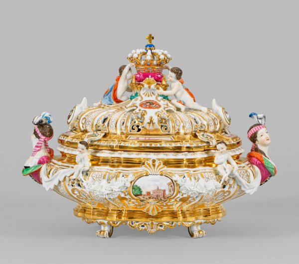 Ovaler, mehrfach verkröpfter, doppelwandiger und ornamental durchbrochen gearbeiteter Korpus. Seitlich Griffe in Gestalt einer plastischen Frauenbüste. Reicher plastischer Dekor aus kleinen Puttenfiguren, verbunden durch Blumengirlanden und Tuchgehänge. Beidseitig der Wandung muschelbekrönte Volutenreserven mit Kauffahrteiszenen. Korrespondierend gestalteter Deckel mit plastischem Knauf, gestaltet als Königskrone mit Reichsapfel auf Kissen, sowie aufgelegten Kartuschen, darin das goldgerahmte polnisch-litauische Königswappen mit dem kursächsischen Wappen. Deckelunterseite mit Blumenrelief. Polychrome Malerei und reicher Golddekor. Innen vergoldet. Entw. Johann Joachim Kaendler. Minim. rest.; Modell-Nr. B 136. Schwertermarke. H. 20,5 cm.