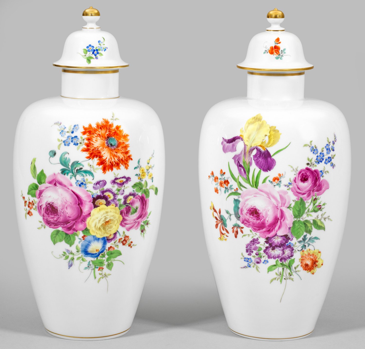 Balusterförmiger Korpus mit gerundeter Schulter und abgesetztem, zylindrischem Hals. Die aufgewölbten Deckel mit teilvergoldetem Kugelknauf. Schauseitig unterschiedliche großflächige, farbenfrohe Blumenarrangements, rückseitig je eine große Einzelblume in äußerst feiner polychromer Malerei. Korrespondierender Dekor auf den Deckeln. Goldrand. Schwertermarke. H. 45,5 cm.