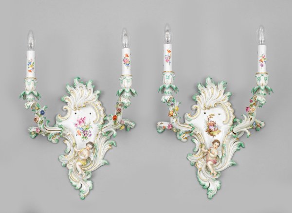 2-flg.; Reliefiertes, mit aufsteigenen Blattvoluten gerahmtes, in Seegrün staffiertes Wandschild mit großer Blattbekrönung. Mittig galante Watteauszene in baumbestandener Landschaft bzw. Blumenarrangement. Unterhalb schwebende Putten mit Blumensträußen. Seitlich geschweifte, mit plastischen Blütenranken belegte Leuchterarme, in vasenförmiger Tülle endend. Polychrome Malerei mit Goldstaffage. Form-Nr. 79218. Teilw. minim. best.; Schwertermarke. H. 39 cm.