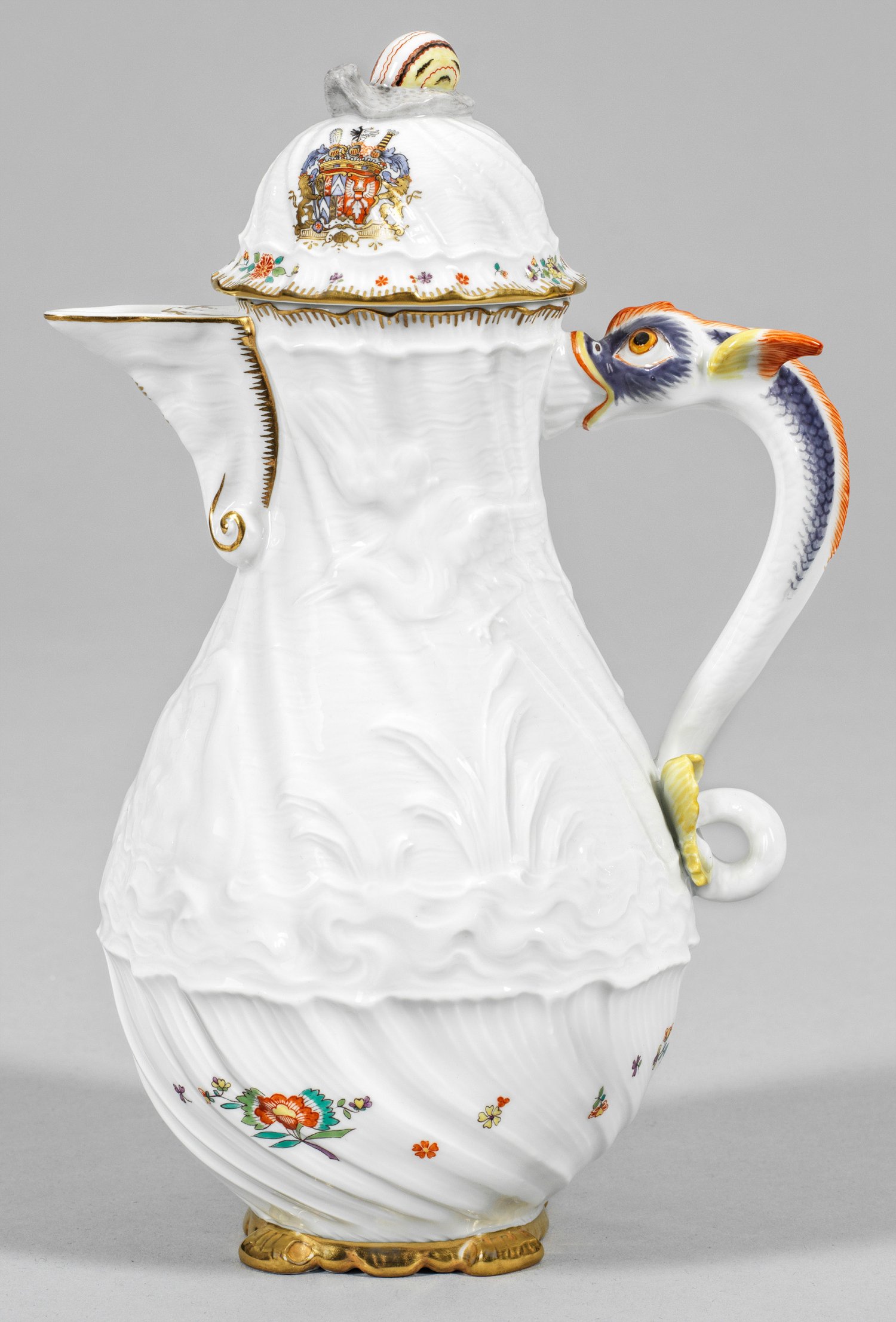 Birnförmiger Korpus mit aufgewölbtem Deckel, mittig plastischer Knauf in Gestalt einer Schnecke. Figürlicher Henkel als Delphin. Auf der Wandung feiner muschelförmiger Reliefdekor aus zwei einander zugeneigten Schwänen, fliegendem und zwischen hohem Schilf stehendem Reiher. Farbiger Indianischer Blütendekor sowie auf dem Deckel das Allianzwappen des Grafen von Brühl und seiner Gemahlin in polychromer Malerei. Gekämmte Goldkante und -staffage. Entw. Johann Joachim Kaendler und Johann Friedrich Eberlein. Schwertermarke. H. 25,5 cm.