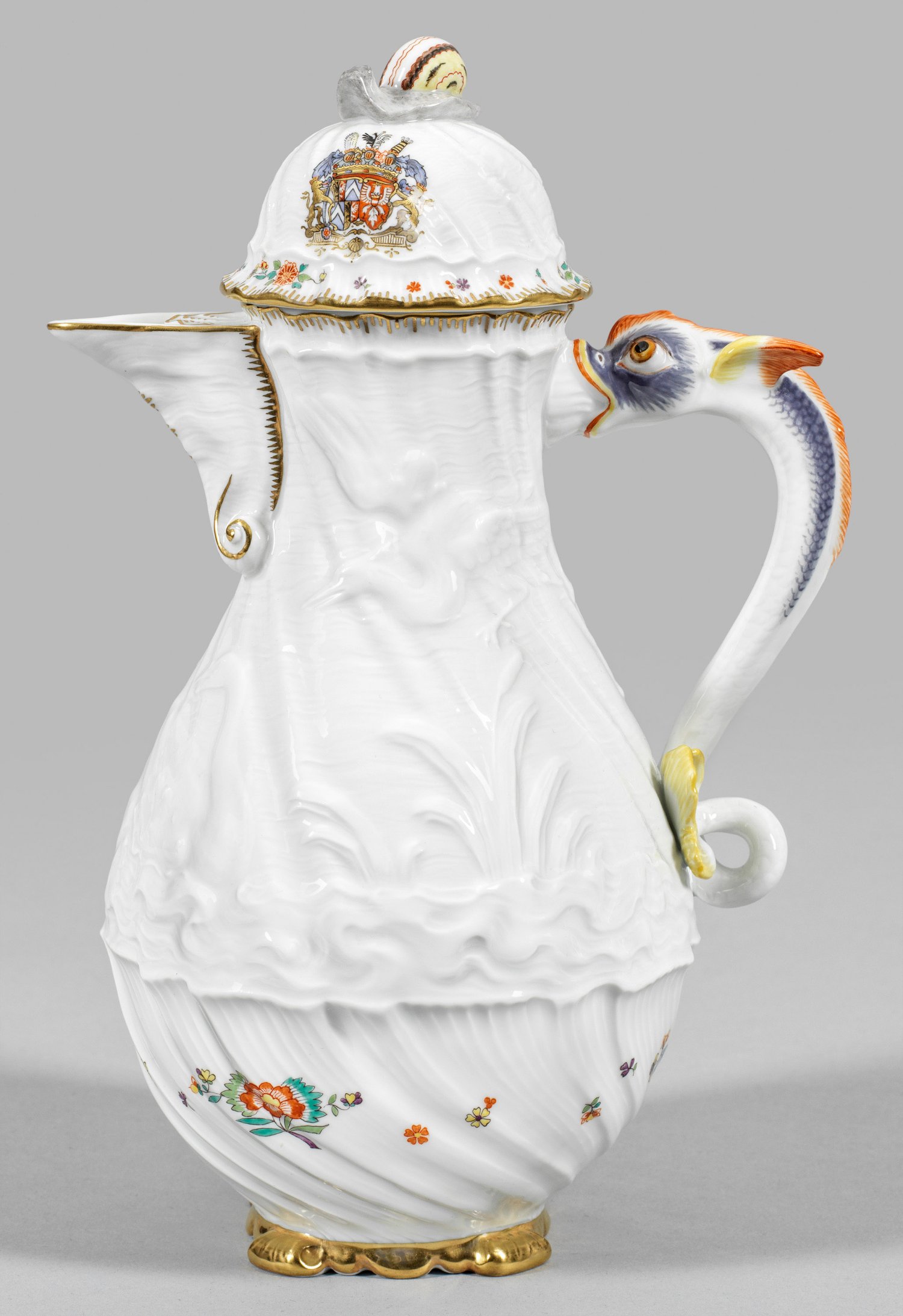 Birnförmiger Korpus mit aufgewölbtem Deckel, mittig plastischer Knauf in Gestalt einer Schnecke. Figürlicher Henkel als Delfin. Auf der Wandung feiner muschelförmiger Reliefdekor aus zwei einander zugeneigten Schwänen, fliegendem und zwischen hohem Schilf stehendem Reiher. Farbiger Indianischer Blütendekor sowie auf dem Deckel das Allianzwappen des Grafen von Brühl und seiner Gemahlin in polychromer Malerei. Gekämmte Goldkante und -staffage. Entw. Johann Joachim Kaendler und Johann Friedrich Eberlein. Jahreszeichen. Schwertermarke. H. 25,5 cm.