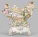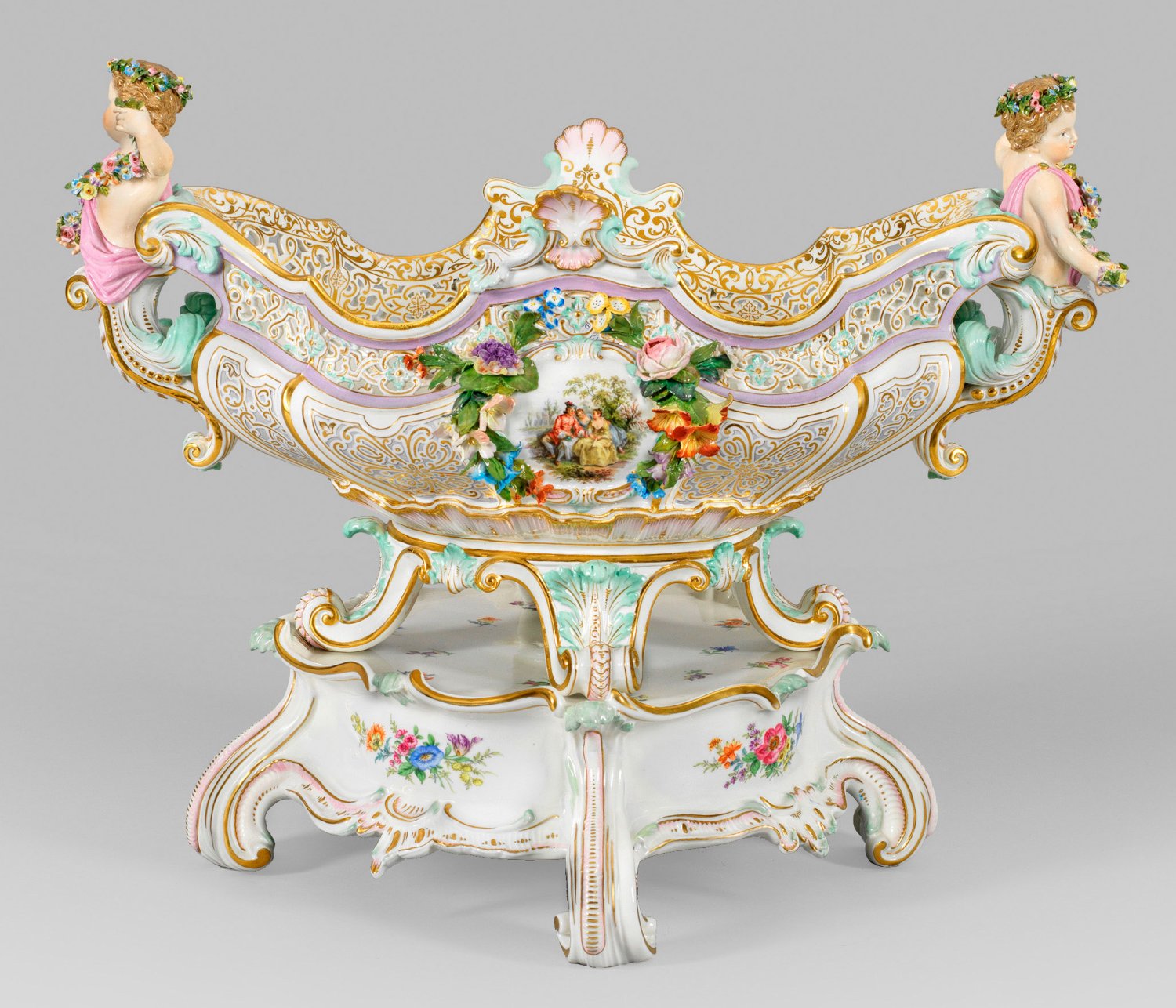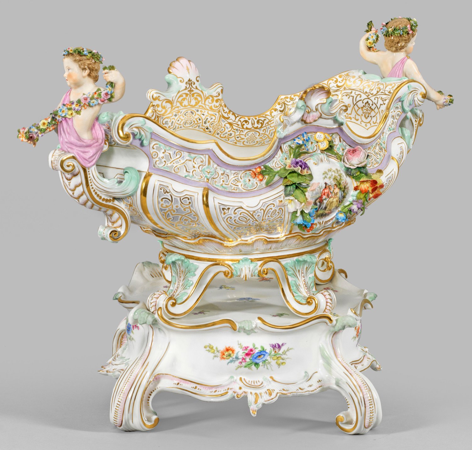 auf rechteckigem, von kräftigen, gebogten Blattfüßen getragenem, rocaillereliefiertem Sockel. Ovale Schale auf vier mit Akanthusblattreliefs belegten Volutenfüßen. Bombierter, durch vertikale Grate gegliederter Korpus über muschelreliefiertem Ansatz mit ausladender, passig ein- und ausschwingender Randzone in floraler Durchbrucharbeit mit Rosettenrelief im Rapport. Seitliche Handhaben in Gestalt von blumenbekränzten Puttenhermen mit Girlanden über schuppenartig reliefiertem, volutiertem Schaft. Umlaufend reliefplastischer, in zartem Rosa und Seegrün staffierter Rocailledekor. Auf der Wandung große, profilgerahmte Reserven mit arabeskem Goldrankendekor auf fliederfarbenem Fond, beidseitig ausgesparte, von üppigen, plastisch aufgelegten Blumenfestonen umzogene, muschelbekrönte Kartusche mit feiner Watteauszene. Im Spiegel große Goldrankenrosette sowie korrespondierende breite Goldrankenbordüre. Sockel. Polychrome Malerei mit reicher Goldstaffage. Entw. Ernst August Leuteritz, um 1882- 1885. Modell-Nr. N 129 und 2772. Unw. rest.; Schwertermarken. Meissen. 2. Hälfte 19. Jh. Schalen-H. 30 cm. 54 cm x 32 cm. Sockel-H. 13 cm. 27 cm x 27 cm.