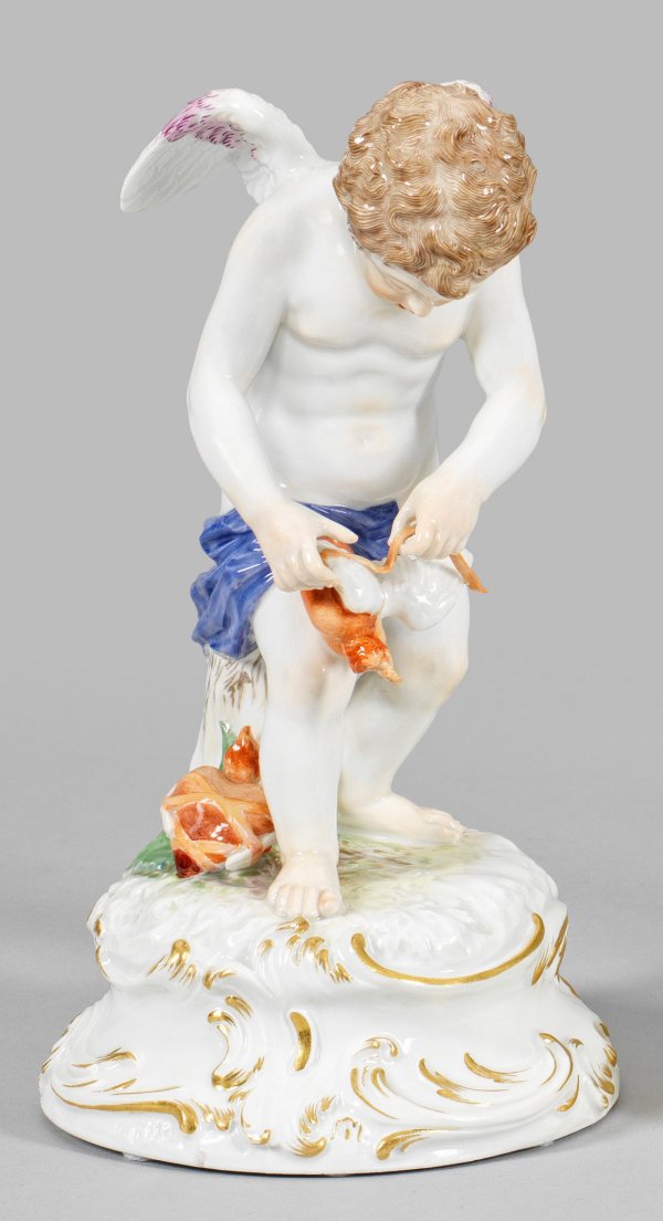 Über gehöhtem, rocaillereliefiertem Natursockel stehender Amor, ein geflügeltes Flammenherz mit einem Band verschnürend. Polychrome Malerei mit Goldstaffage. Entw. August Ringler. Modell-Nr. P 139. Minim. best.; Schwertermarke. H. 20 cm.