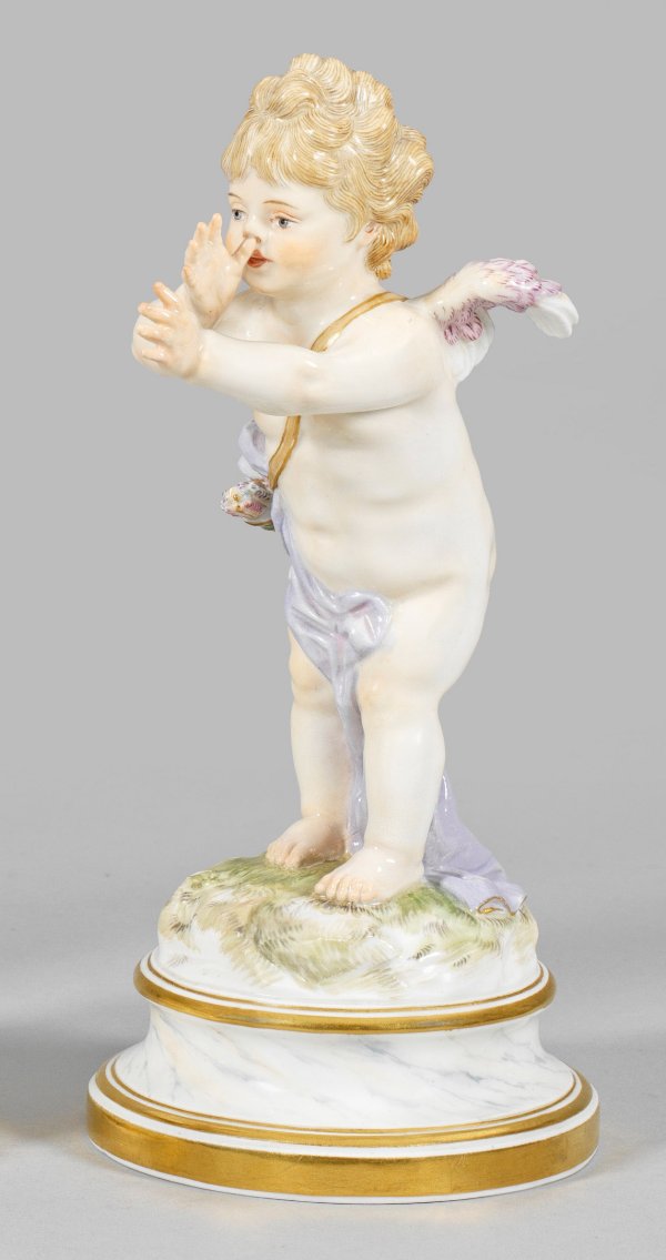 Auf profiliertem, marmoriertem Rundsockel stehender Amor, die Hände zur Spottgeste an die Nase richtend. Polychrome Malerei mit Goldstaffage. Entw. Heinrich Schwabe. Modell-Nr. L 125. Minim. rest.; Schwertermarke. H. 20 cm.