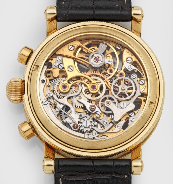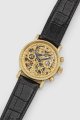 Gelbgold, gest. 750. Rundes, fein geriffeltes Uhrengehäuse, beidseitig verglast, skelettiertes Zifferblatt mit gebläuten Lanzenzeigern, Chronograph aus der Mitte, kleine Sekunde und Stunde. Schwarzes Krokodilleder-Armband mit Faltschließe in 18 ct. Gold. Automatikwerk mit Handaufzug. Referenz- und Gehäuse.-Nr. CH2321/102. Auflage 102/600. Originales Etui und Einleitungsheft sowie Garantie-Urkunde. Gew. ca. 75,85 g.