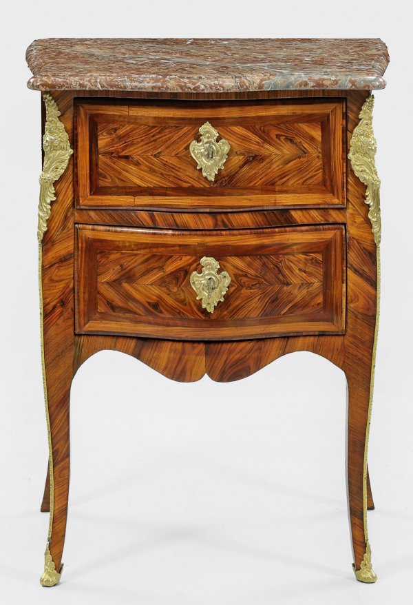 Palisander, furniert. Dreiseitig bombierter Korpus mit ausgebogter Zarge, flankiert von schmalen, leicht ausgezogenen Ecklisenen mit applizierten Maskarons, in hohe, leicht geschweifte Beine übergehend. In der gegliederten Front zwei Schubladen. Flächendeckend gespiegelt angeordnete Furnierfelder. Profilgerahmte Deckplatte aus rotbraunem, grau gemasertem Marmor, rest.; H. 82 cm. 63,5 cm x 45 cm.