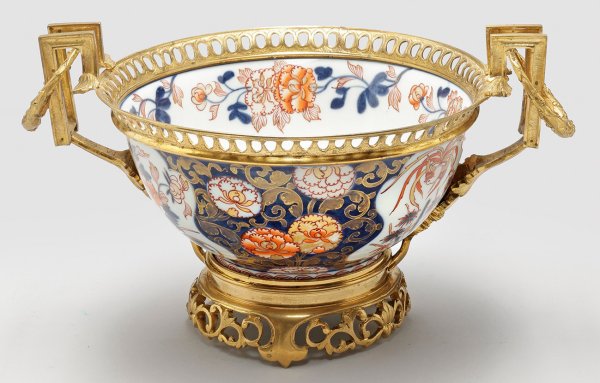 Porzellan mit vergoldeter Bronzemontierung. Über rankenförmigem Sockel tief gemuldete Schale mit Galerierand. Seitlich tief ansetzende, gekantete Handhaben mit Lorbeerfeston. Auf der Wandung, in kobaltblauem Fond, große Päonien zwischen Rankenwerk sowie ausgesparte Reserven, darin sog. Fels-und Vogeldekor mit aufsteigenden Prunus-, Päonien- sowie Bambuszweigen, oberhalb fliegender Hôô-Vogel. Korrespondierender Blumendekor auf der Innenwandung. Unterglasurblaue Malerei, überdekoriert in Eisenrot und Gold. Manufakturmarke. H. 22 cm. D. 28 cm.
