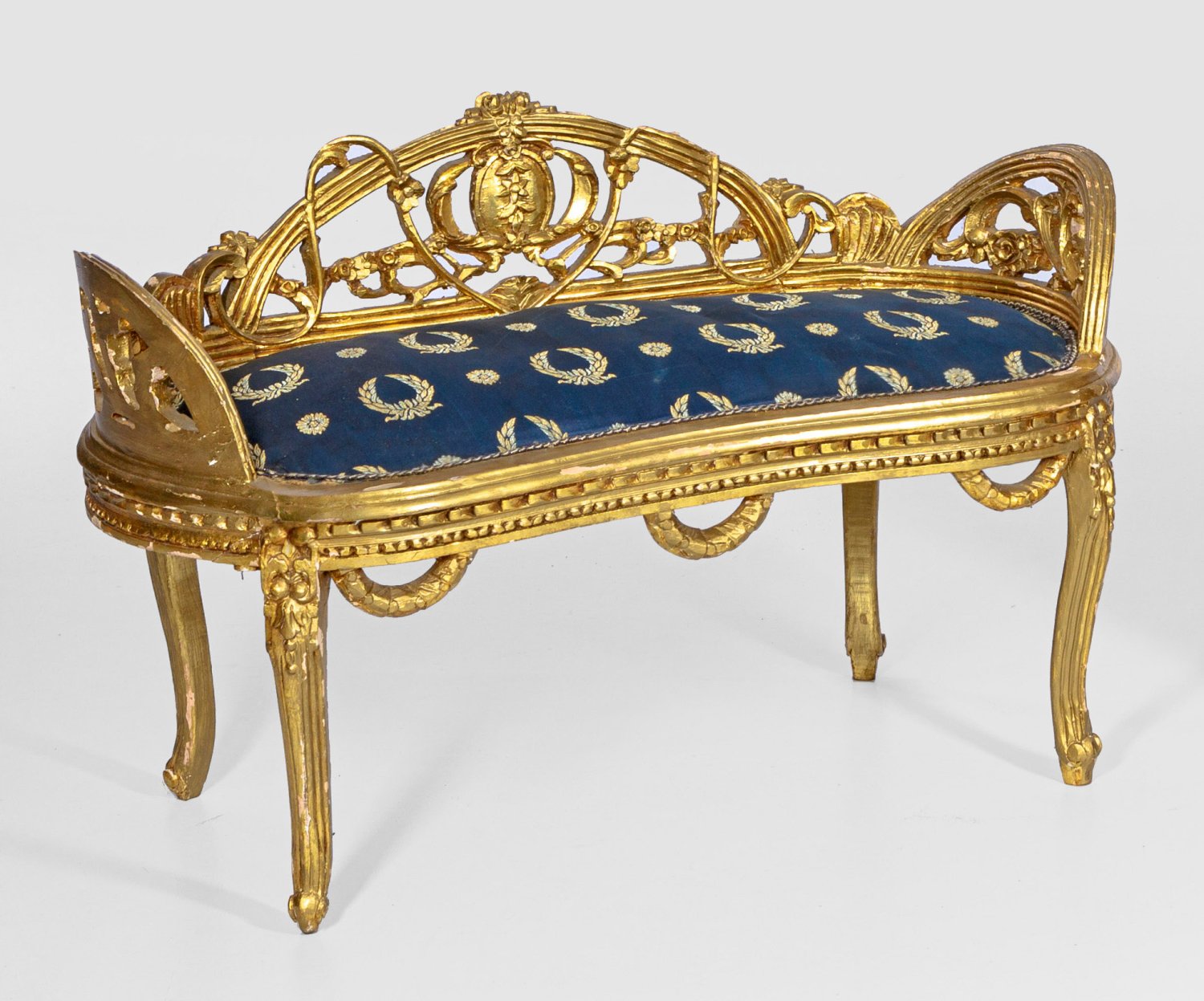 Holz, reliefiert und vergoldet. Passig geschweifte Profilzarge auf geschwungenen Beinen. Niedrige, durchbrochen gearbeitete Lehnenrahmung aus Volutenmotiven. Sitzfläche gepolstert und bezogen. H. 65 cm. 101 cm x 50 cm. Sitz-H. 43 cm.