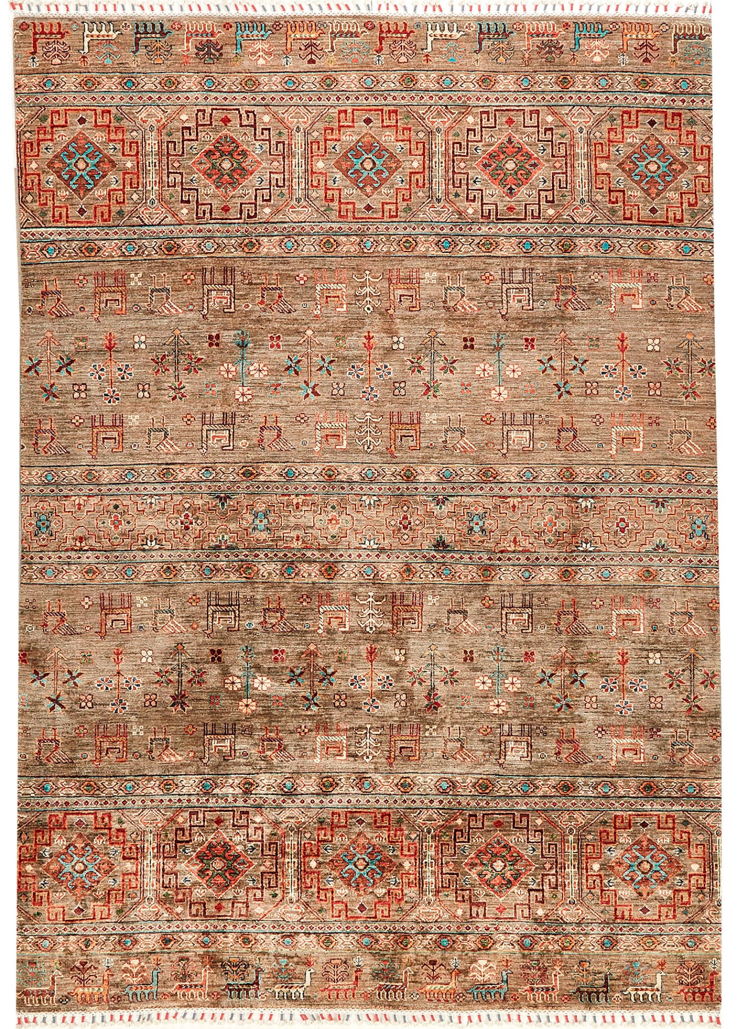 Afghanistan. Wolle auf Baumwolle. Naturfarben. Auf beigefarbenem, abraschiertem Fond flächendeckende Musterung aus unterschiedlich breiten Streifen mit stilisierten Tieren und Blüten sowie Rautenmotiven und Bändern. 241 cm x 177 cm.