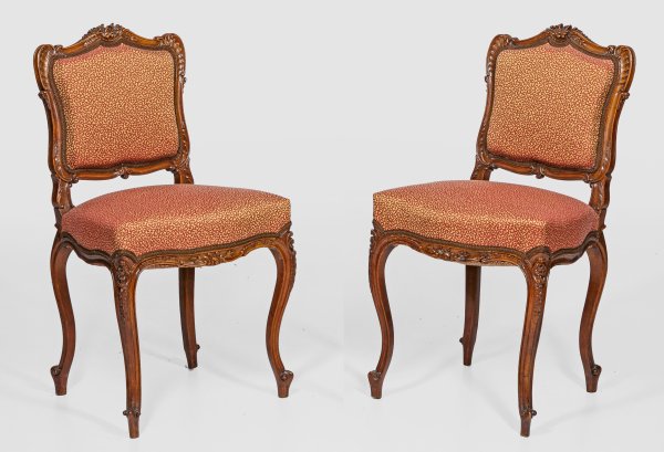 Nussbaum, teilw. geschnitzt. Bombierte Zarge auf schlanken, geschweiften Beinen sowie schildförmige Rückenlehne aus reliefierten Rocaillen. Gepolstert und bezogen. Sitz-H. 48 cm.