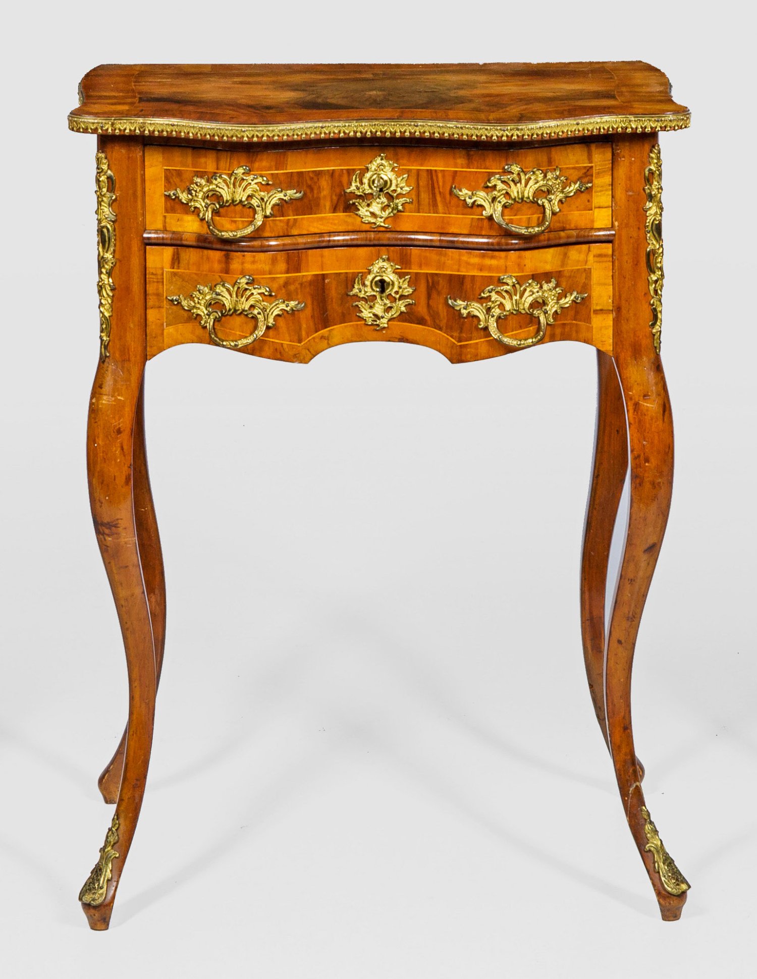 Nussbaum, massiv und furniert. Gerader, passig geschweifter Zargenkasten auf hohen, geschwungenen Beinen. In der gegliederten Front zwei doppelt geschweifte Schubladen, teilw. mit Facheinteilung für Nähutensilien. Gering überstehende, profilierte Deckplatte. H. 82 cm. 62 cm x 47 cm.