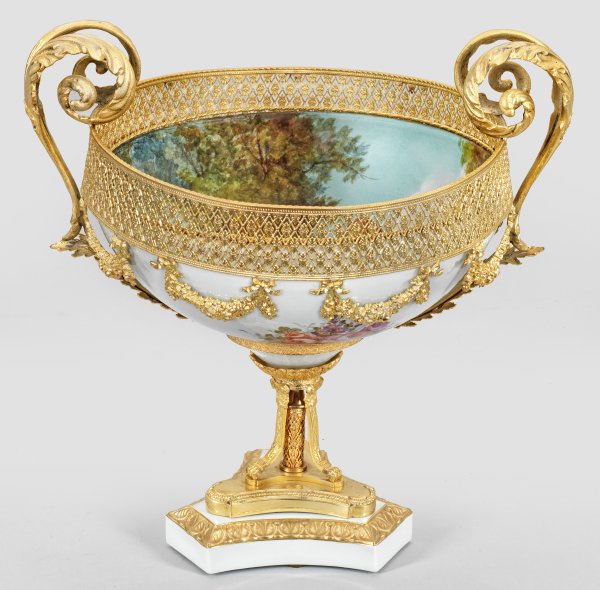 Porzellan sowie vergoldete Bronze. Über konkav eingezogener Sockelplatte von schmalen Streben flankierter Schaft als Träger für tief gemuldete Schale. Flächendeckender Dekor mit der Darstellung der Jagdgöttin Diana in baumbestandener Landschaft, bez. "Jeanne". Durchbrochen gearbeiteter Reif sowie Henkel aus eingerollten Blattvoluten. H. 39 cm.