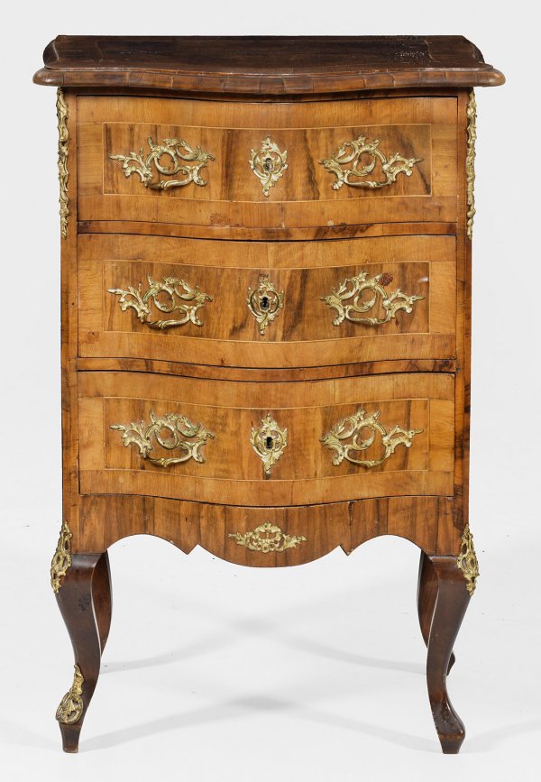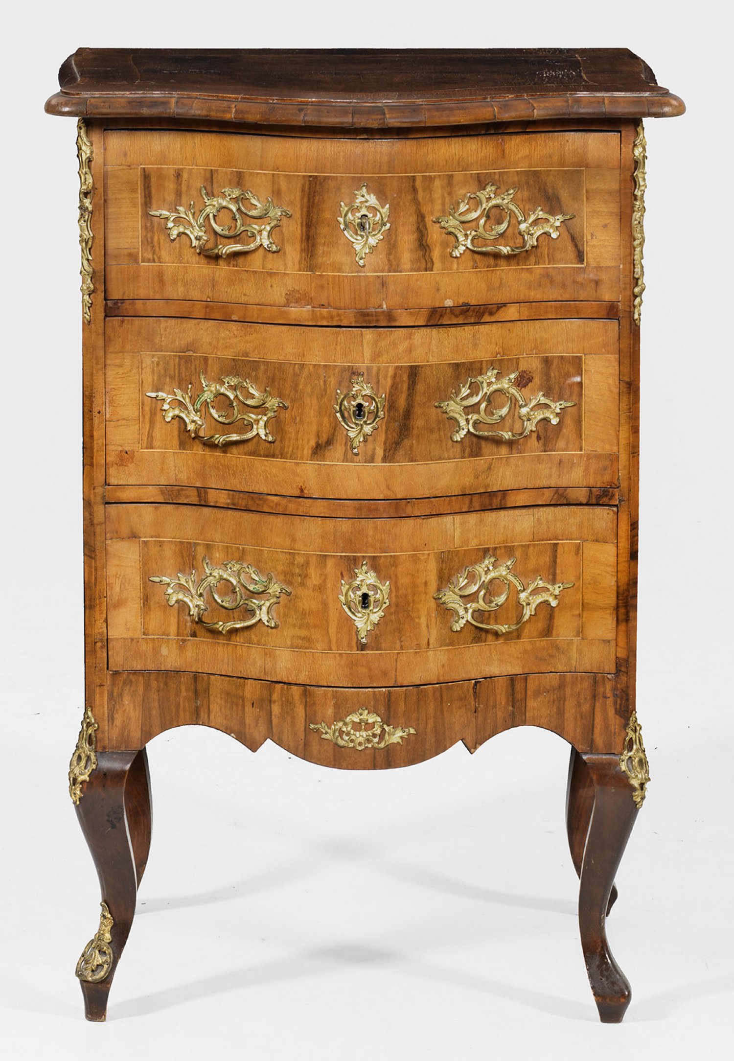 Nussbaum, furniert. Gerader, hochrechteckig angelegter Korpus auf geschwungenen Beinen. In der gegliederten Front drei bombierte Schubladen. Gering überstehende, profilierte Deckplatte. Applikationen aus Bronze. H. 94,5 cm. 62 cm x 47 cm.