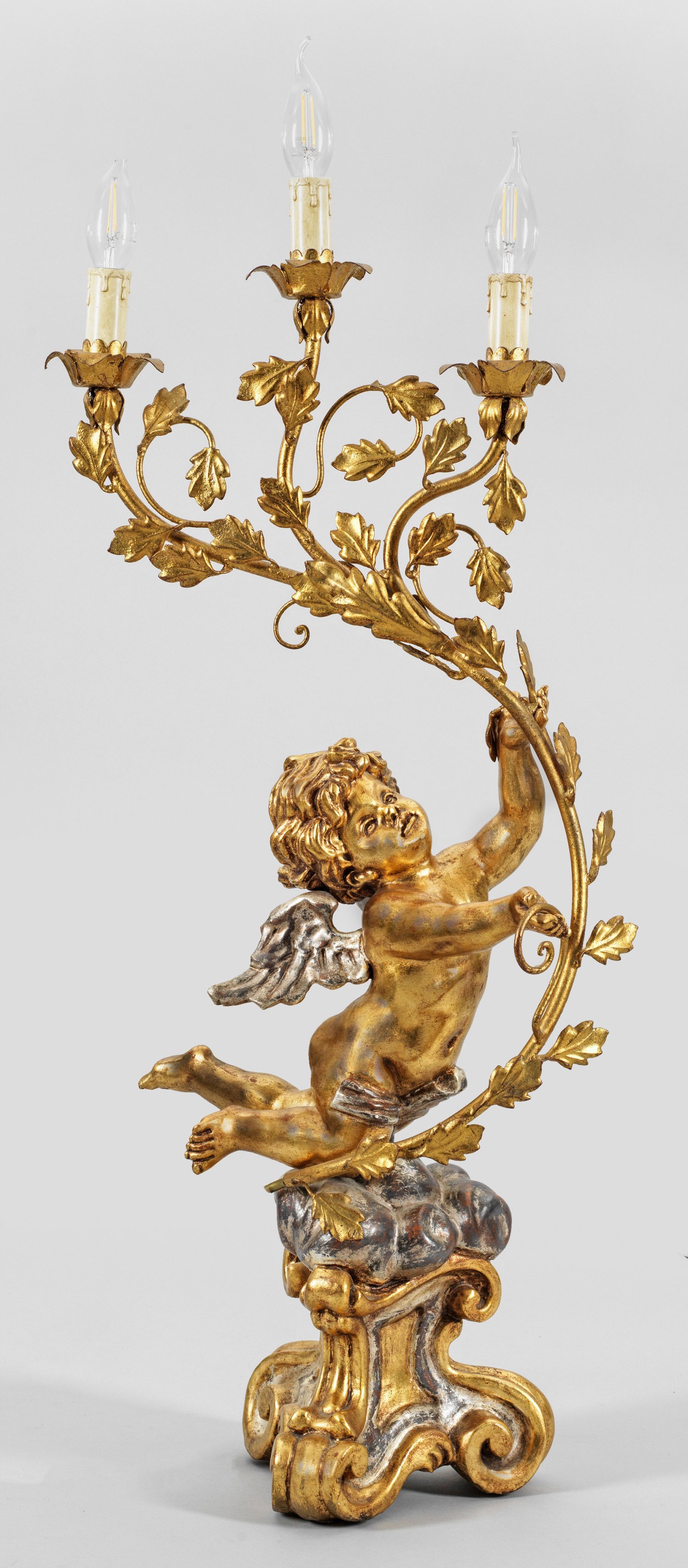 3-flg.; Holz, geschnitzt, gefasst und vergoldet sowie teilw. versilbert und goldfarben lackiertes Metall. Über geschweift ansteigendem Volutensockel sowie stilisiertem Wolkenelement vollplastische Darstellung eines Putto, einen stark geschwungenen Zweig als Träger für Leuchtmittel emporhaltend. Elektrifiziert. H.85 cm.