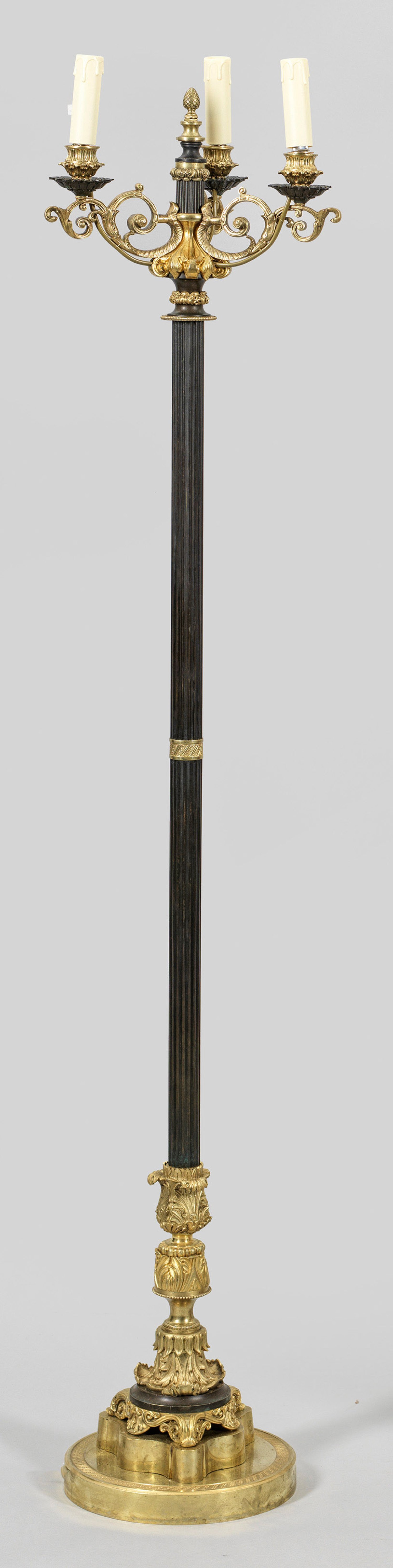 3-flg.; Bronze, dunkel patiniert und teilw. vergoldet. Über runder Plinthe gestuft ansteigender Sockel. Davon ausgehend teilw. blattreliefierter, godronierter Schaft als Träger für Leuchterarme aus eingerollten Voluten. Elektrifiziert. H. 144 cm.