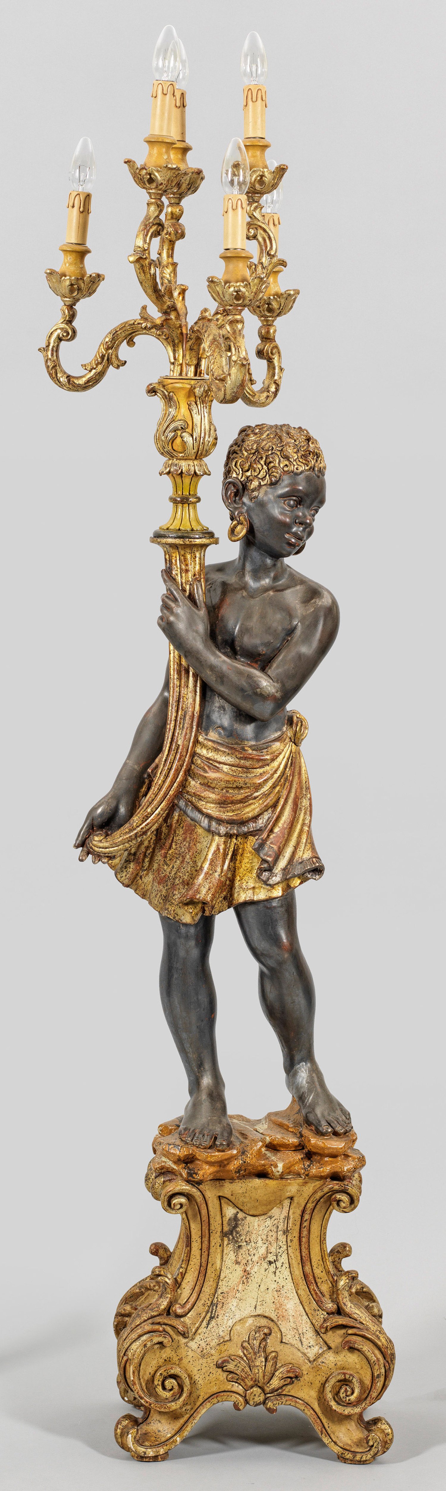 6-flg.; Holz, geschnitzt, gefasst und vergoldet. Über geschweift ansteigendem Rocaillensockel vollplastische Darstellung einer Mohrin ein Füllhorn emporhaltend. Oberhalb davon ausgehend stark geschwungene Leuchterarme. Elektrifiziert. Ges.-H. 182 cm.
