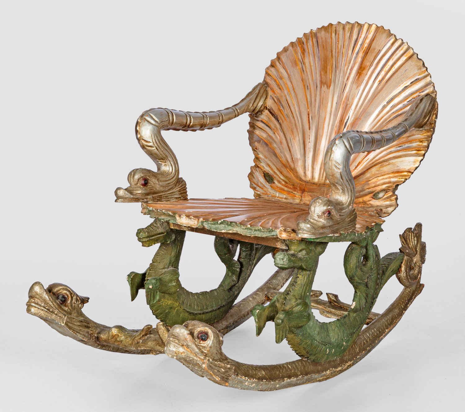 Holz, geschnitzt, seegrün und silberfarben gefasst. Vollplastische Darstellung von zwei stilisierten Seepferdchen als Träger für flache Sitzfläche und korrespondierende Rückenlehne in Form von Jakobsmuscheln, flankiert von Delfinen als Armlehnen. Unterhalb stark gebogte Kufen in Gestalt von Seeschlangen, durch korallenartige Stege verbunden. H. 86 cm. 65 cm x 108 cm. Sitz-H. 44 cm.
