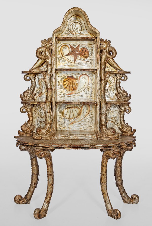 Holz, geschnitzt und silberfarben gefasst und partiell vergoldet. Über hohen, konkav eingezogenen Beinen in Gestalt von Delfinen, demilune-artige Deckplatte in Form einer großen Muschelhälfte. Oberhalb hoher, offen gestalteter Aufsatz, flankiert von korrespondierenden Delfinen unterschiedlicher Größe mit hochgewölbtem oberen Abschluss sowie passig geschweiften Regalböden in Form von Muscheln. Flächendeckender Dekor aus reliefierten Seesternen und unterschiedlichen Muscheln. H.187 cm. 118 cm x 47 cm.