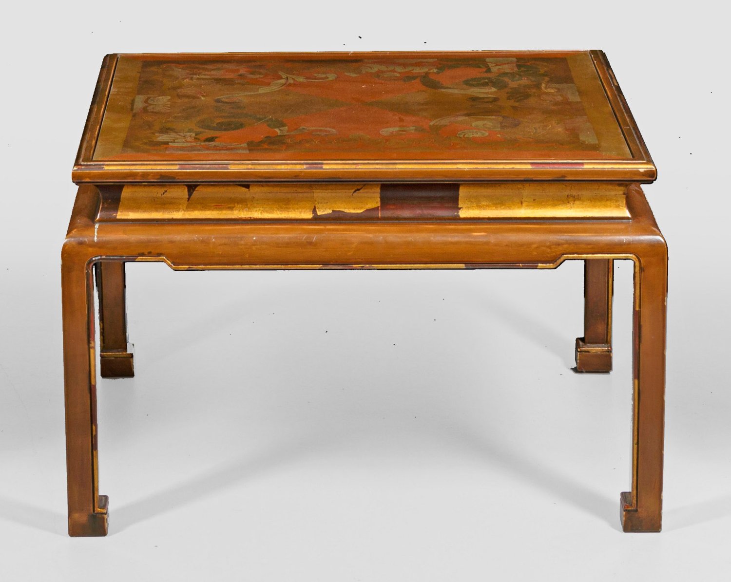 Holz, in unterschiedlichen Brauntönen lackiert und teilw. vergoldet. Gerundete Zarge auf gekanteten Beinen als Träger für rechteckige, profilierte Deckplatte mit üppigem Dekor aus Blattvoluten. Bez. Dieken München St. Paul France. H. 43 cm. 67 cm x 56 cm.