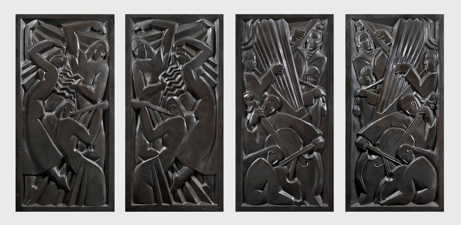 Vier große Art Déco-Reliefs mit Orchestermusikern und Tanzenden