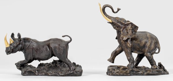 Gegenstücke. Bronze, teilw. vergoldet. Ein Elefant als "Giant of the Serengeti" mit vergoldeten Stoßzähnen und ein Nashorn als "Thunder on the plains" mit vergoldeten Hörnern, sich beide energisch bewegend auf einem Grassockel. Herstellerstempel Copyright FM. Auf der Unterseite jeweils eine Plakette. Edition The Franklin Mint pour l' African Wildlife Foundation. H. 15 cm - 25 cm.