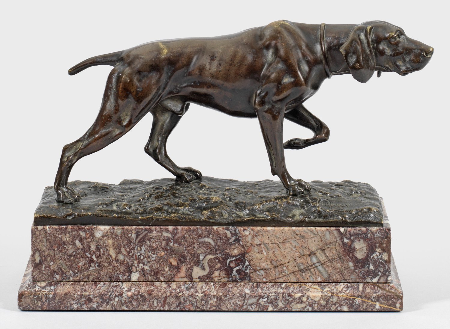 Bronze, dunkelbraun patiniert. Sign.; Dunkelroter Marmorsockel. Ges.-H. 20,5 cm; B. ca. 30 cm.