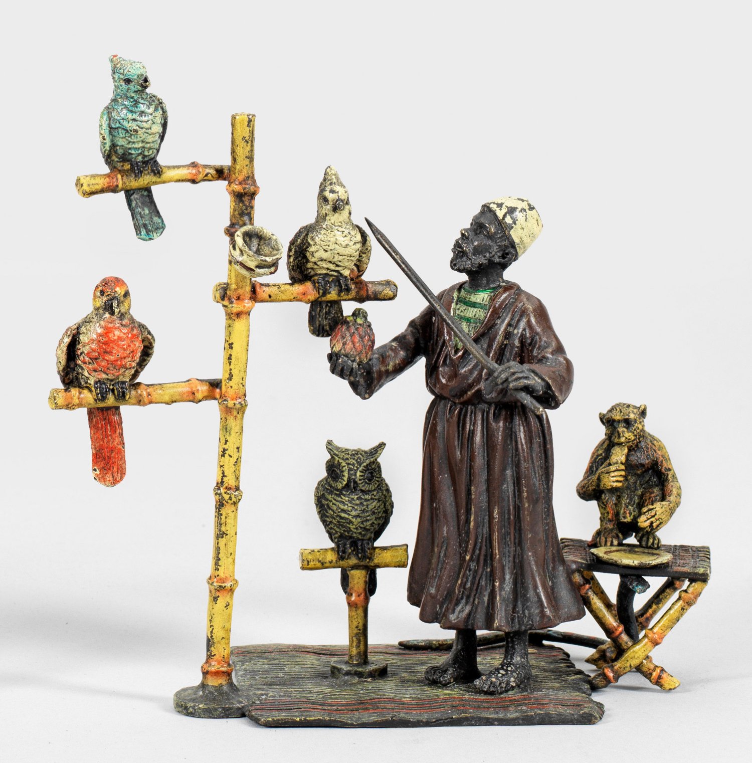 A painted Vienna bronze of a parrots breeder. Maker's marks. Minor rubbed.