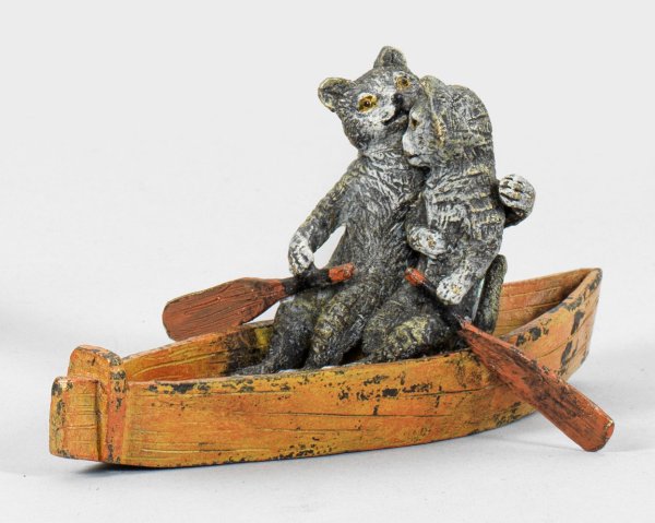 A painted Vienna bronze figure of two cats in a boat. Minor rubbed.
