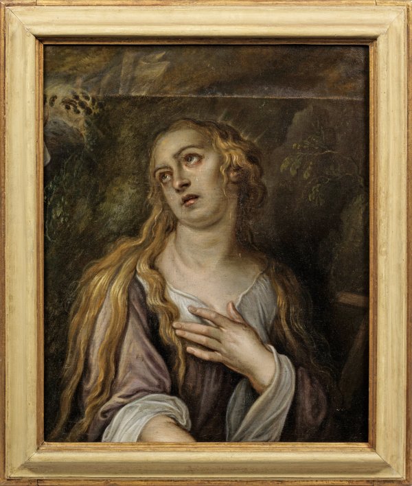 Brustbildnis der Heiligen mit diagonal zu ihrer Rechten, zum Himmel gewandtem Kopf und langem, blondem, offenem Haar, über ihren Wangen mehrere Tränen, ihrer linke Hand vor ihr Dekolletee gelegt. In der Komposition der Figur in augenfälliger Weise durch die Barock-Gemälde Renis beeinflusstes Werk. Öl/Lwd., doubl.; Oberhalb horizontale Falte. 76 cm x 64 cm. Rahmen.