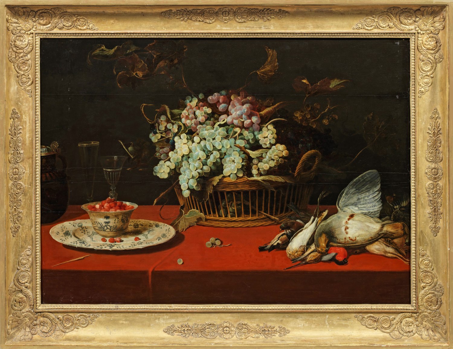 Kunstvoll und ausgewogen hat Snyders dieses Stillleben komponiert. Arrangiert auf einem mit leuchtendrotem Tuch bedeckten Tisch werden dem Betrachter diverse, verführerische, delikate Köstlichkeiten präsentiert: mittig ein großer, durchbrochen geflochtener Weidenkorb, üppig gefüllt mit sich auftürmenden, weißen und dunkelroten Trauben, auf der linken Seite Erdbeeren in einer Porzellankumme sowie auf einem dazu passenden Teller, gegenüber unterschiedliche, erlegte Wildvögel. Vervollständigt wird das Ensemble durch zwei Gläser und eine Schenkkanne neben dem Obstkorb und hinter der Erdbeerschale. Snyders stellt dabei auch die Kostbarkeit der erlesenen Objekte eindringlich zur Schau - sichtbar im importierten, chinesischen, blauweißen Wanli-Porzellan und der Weinkaraffe mit der Silbermontierung. Hella Robels datiert dieses Stillleben zwischen 1612 und 1615 in die frühe Schaffenszeit des Künstlers. Snyders begann seine malerische Ausbildung 1593 in der Werkstatt von Pieter Brueghel dem Jüngeren, auch Hendrick van Balen zählte zu seinen Lehrmeistern. 1603 entstand sein erstes bekanntes Werk, ein Stillleben mit Wild, Vögeln, Obst und Gemüse. 1608/09 reiste er nach Italien, wo er sich in Rom und Mailand aufhielt. Mithilfe von Empfehlungsschreiben des mit ihm befreundeten Jan Brueghel d. Ä. konnte er sich auch beim berühmten Kunstsammler Kardinal Borromeo vorstellen und wurde dessen Förderung zuteil. 1609 kehrte Synders in das heimatliche Antwerpen zurück. Schon kurz danach begann in den 1610er-Jahren seine kongeniale Zusammenarbeit mit Peter Paul Rubens. Parallel hierzu entwickelte er, basierend auf den Küchen- und Marktstücken des 16. Jhs., in neuartiger Weise das autonome, barocke, flämische Stillleben, wobei er Früchte mit Wild und erlegten Vögeln kombinierte, zuweilen auch mit lebenden Tieren. Seine opulenten Stillleben zeichnen sich sowohl durch ein kraftvolles Kolorit als auch durch ein artifizielles Arrangement der Objekte aus. Diese gibt er höchst realistisch in ihrer Materialität bzw. naturnah und genau beobachtet wieder - auch die Wildvögel in diesem Stillleben mit ihrem schwer darzustellenden, zarten, weichen Gefieder. Hierdurch prägte er die flämische Stilllebenmalerei in der ersten Hälfte des 17. Jhs.; Öl/Eichenholztafel, parkettiert. 75 cm x 107 cm. Rahmen.
