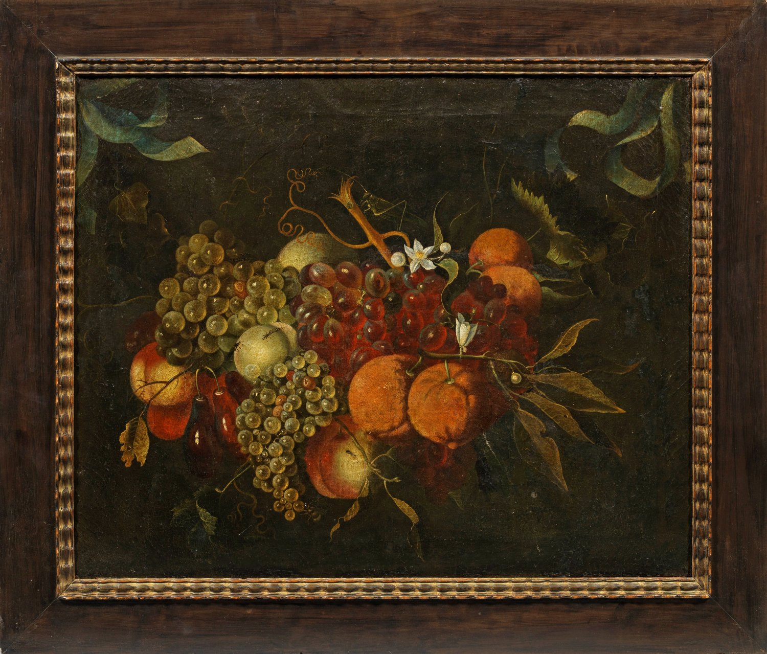 Als Bouquet arrangiertes, üppiges Früchtestillleben mit Weintrauben und -reben, Mandarinen an blühenden Zweigen und Pfirsichen, belebt durch feinmalerisch, naturnah und detailreich wiedergegebene Insekten, darunter eine große Heuschrecke (Grünes Heupferd). Geschwungene Bänder in den beiden oberen Bildecken assoziieren einen geöffneten Beutel, der den Blick auf die frischen Früchte freigibt. Minutiös feingemaltes, äußerst naturalistisches Tableau Marrels, der 1624-1632 bei Georg Flegel in Frankfurt lernte und 1632 in die Werkstatt Jan Davidsz. de Heem nach Utrecht ging. Nachdem er bereits in Utrecht eine eigene Werkstatt betrieben und Abraham Mignon als Schüler aufgenommen hatte, war er 1650-1665 in Frankfurt ansässig. Dort heiratete er 1651 Johanna Sybilla Merian (Witwe von Matthäus Merian d. Ä.), wodurch er der Stiefvater und späterer Lehrer von Maria Sibylla Merian wurde. In seinem Oeuvre beeinflussten ihn außer Jan Davidsz. de Heem auch Roelant Savery und Ambrosius (II) Bosschaert. Laut Fred G. Meijer, bis 2017 Chefkurator am RKD in Den Haag, stammt das vorliegende Gemälde aus der letzten Schaffensperiode Marrels nach 1675. Öl/Lwd., doubliert. Verso altes Papieretikett eines Baseler Restaurators. Altrest.; 46,5 cm x 58 cm. Rahmen.