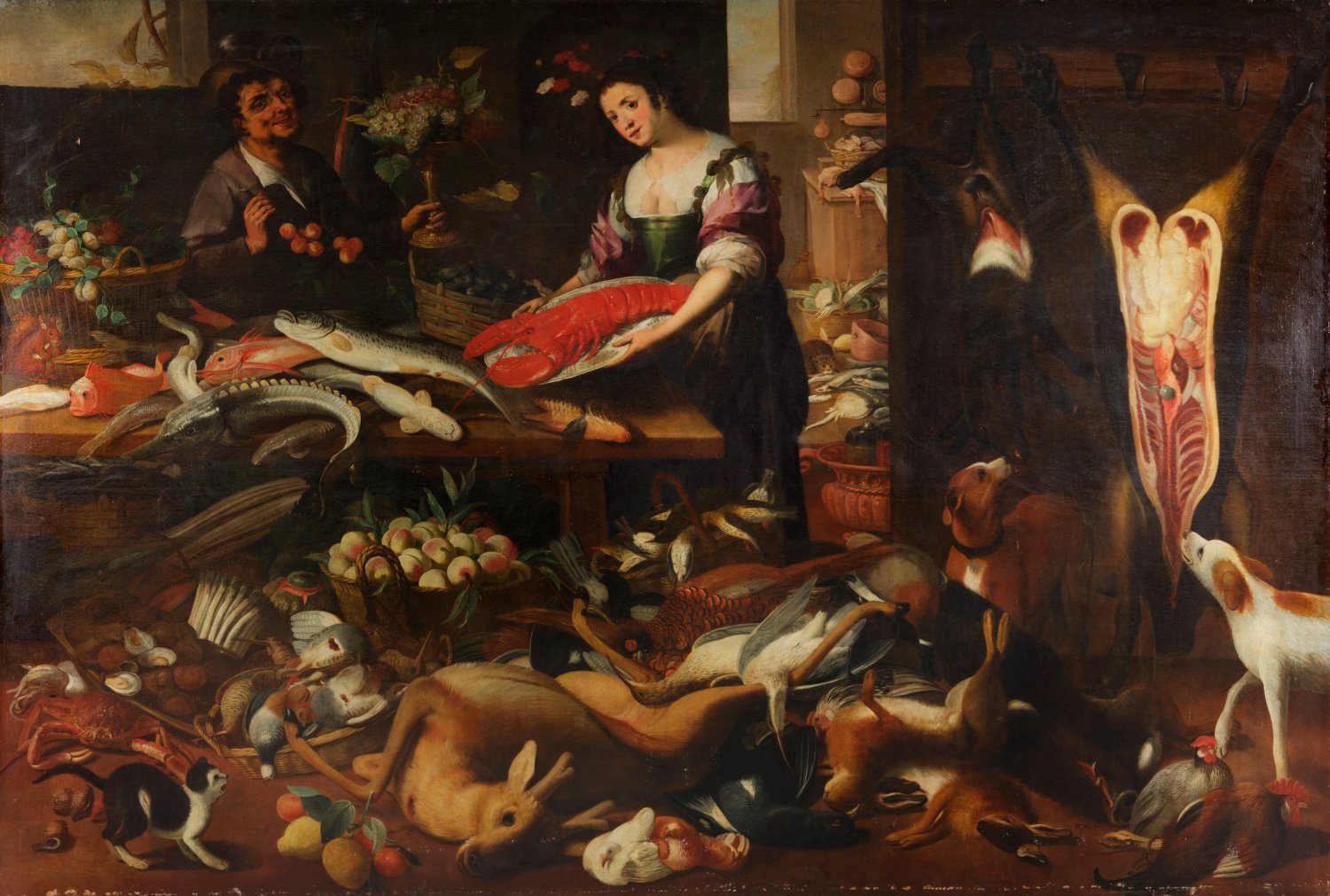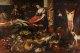 Gegenstücke. Die monumental großen Gemälde schildern in der Art eines "Wimmelbildes" opulent gefüllte Vorratskammern mit unterschiedlichsten delikaten Speisen - Früchte, Gemüse, Wild, Fische und Meeresfrüchte. Diese locken auch diverse lebendige Tiere, wie mehrere Hunde, eine Katze, einen Marder, ein Eichhörnchen, einen Papagei und ein Taubenpaar an. Hinzukommen jeweils ein Figurenpaar mit einer Küchenmagd bzw. einer jungen Dame, die auf einem der Gemälde auch die fleischlichen Gelüste eines älteren Mannes erregt. Pseudo-Jan van Kessel ist ein Notname für einen Künstler (oder eine Werkstatt), dem inzwischen weit über 200 Gemälde, vornehmlich kleine Stillleben, zugeschrieben werden. Dieses Oeuvre wurde (weitgehend) in Ertz/Nitze-Ertz 2012 als Werk von Jan van Kessel d. J. katalogisiert, dessen wenig bekanntes authentisches Oeuvre in Stil und Ausführung das RKD in Den Haag jedoch als abweichend ansieht. Der Einfachheit halber wurden die Gemälde von Pseudo-Jan van Kessel II zuvor (bis 2017) vom RKD in Den Haag als Werkstatt von Jan van Kessel (I) katalogisiert. Sie kommen oft paarweise vor, gelegentlich auch als größere Ensembles, sind meist klein und wurden auf (ungemarkten) Kupfertafeln gemalt, zuweilen auch auf Walnussplatten und einmal auf Schiefer. Diese Indizien und die Tatsache, dass einige Werke italienischer Provenienz sind, legen nahe, dass diese Werke, obwohl sie einen flämischen Charakter haben, wohl in Italien entstanden. Der Künstler mag laut RKD durchaus Flame oder flämischer Abstammung gewesen sein; gelegentlich wurden die Motive von flämischen Vorbildern entlehnt, aber nur in einem Fall von Jan van Kessel, zu dessen Oeuvre sonst kein weiterer spezifischer Bezug besteht. Öl/Lwd., doubl.; 210 cm - 214 cm x 313 cm - 318 cm.