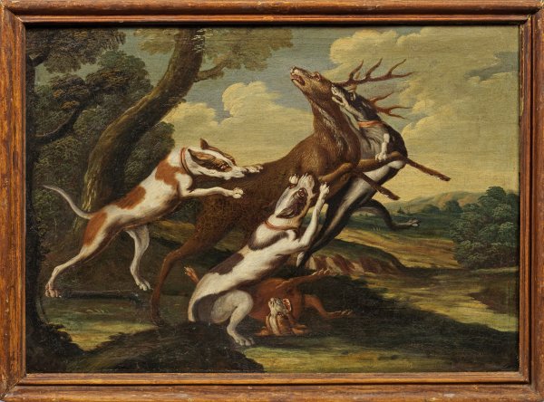 Motiv und Komposition des Barock-Gemäldes sind sichtlich durch Frans Snyders beeinflusst, den bedeutenden flämischen Tier- und Stilllebenmaler. Snyders, ein Schüler von Pieter Brueghel d. J. und Hendrick van Balen, wurde 1602 Meister der Antwerpener Gilde. Er spezialisierte sich auf die Tiermalerei und avancierte zu einem der gefragtesten Meister seiner Zeit auf diesem Gebiet, der auch für die Habsburger und den spanischen Hof arbeitete. Zu seinen bekannten Schülern gehörten Jan Fijt und Paul de Vos. Vergleichbare Hirschhatzdarstellungen von Snyders befinden sich in zahlreichen Museen.