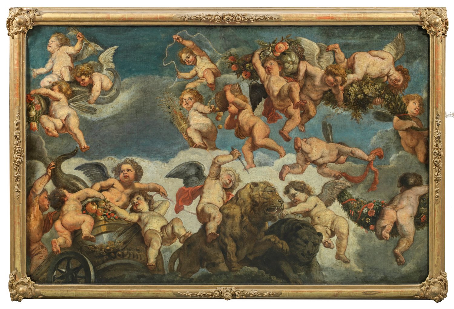 Vielfigurige Darstellung des flämischen Barock. Unterhalb ein von einem Löwen und einem Bären gezogener Triumphwagen, auf dem Engel und Putti mit einem von Früchten gefüllten Füllhorn herumtollen, den Löwen mit einem Stock traktieren und an dessen Maul spielen. Oberhalb tragen weitere Engel und Putti eine lange, große Früchte- und Blumengirlande, Ährenbündel und ein zweites Füllhorn, im Gerangel fallen Früchte aus einem Eimer. Großformatiges Hauptwerk des flämischen Malers, Zeichners und Grafikers, der sich religiösen, mythologischen und allegorischen Themen widmete sowie Wandteppiche entwarf. Die Größe und das, heitere, weltliche Motiv lassen darauf schließen, dass dieses Barock-Gemälde ursprünglich für die Ausstattung eines Schlosses oder für das Haus eines höchst wohlhabenden Bürgers in Auftrag gegeben worden sein dürfte. Schut lernte vermutlich bei Hendrick van Balen oder Jan Brueghel d. Ä.; 1618 wurde er Mitglied der Antwerpener Lukasgilde. 1624-1628 weilte Schut in Italien, bis 1627 in Rom, wo er sich den Bentvueghels anschloss und u. a. Fresken für die Villa des Bankiers und Mäzens Pietro Pescatore (Pieter de Vischere) malte. 1627-28 war er in Florenz, wo er auch Bildteppiche für die Arazzeria Medicea entwarf, die bedeutendste Teppichweberei Italiens. Nach seiner Rückkehr nach Antwerpen wurde er ein gefragter Maler, besonders von Altarbildern. 1635 beteiligte sich der Künstler gemeinsam mit Peter Paul Rubens an der Festdekoration anlässlich des triumphalen Einzugs des Kardinalinfanten Ferdinand in Gent und Antwerpen. Öl/Lwd.; Verso verschiedene Etiketten. 122 cm x 190 cm. Rahmen.