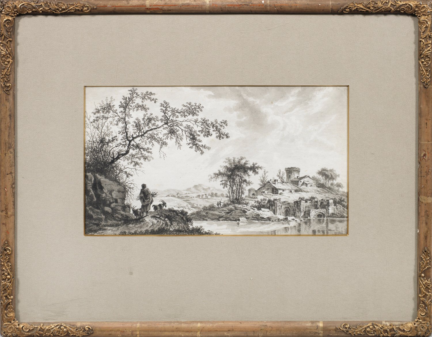 Weiter, panoramaartiger Blick auf eine hügelige, italienisierende Flusslandschaft mit pittoreskem Architekturensemble, am linken Bildrand unter einem diagonal ins Bild ragenden Baum eine Reisigsammlerin mit zwei Ziegen. Durch effektvolle Hell- und Dunkelkontraste sowie nuancierte Grauabstufungen erzielt der Künstler zugleich räumliche Tiefe und atmosphärische Stimmungen. In Motiv, Stil und Einbindung der Architektur zeigt das Blatt evidente Parallelen zu den Landschaften Weirotters. An der Wiener Akademie ausgebildet, ging er 1759 nach Paris, wo ihn Johann Georg Wille beeinflusste und dazu anregte, in der freien Natur zu zeichnen. 1764 war Weirotter für ein Jahr in Rom, von wo aus er die Umgebung und die Toskana bereiste. 1767 wurde Weirotter als Professor für Landschaftszeichnungen an die neugegründete Kupferstecher-Akademie in Wien berufen. Feder u. lavierte Tusche/Papier. 18,5 cm x 33 cm. Rahmen.