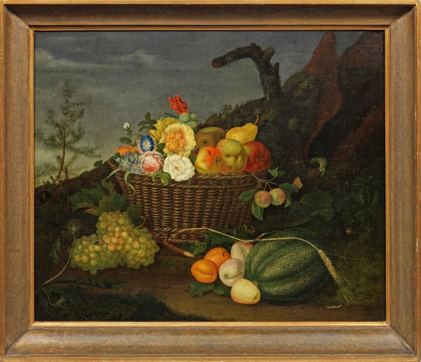 Vor einem alten, bemoosten, diagonal liegenden Baumstamm einer Lärche, in eine Landschaft komponiertes Stillleben aus einem Korb mit unterschiedlichen Blüten und Früchten, davor arrangierte Weintrauben, ein Kürbis, Aprikosen bzw. Pfirsiche, ein Apfel und eine Getreideähre; als belebende Elemente eine Eidechse, diverse Insekten und eine Schnecke. Fein lasierend gemalte, naturgetreue Darstellung in der Tradition der niederländischen Stilllebenmalerei des 17. und 18. Jhs.; Öl/Lwd., auf Holztafel oder dicken Karton kaschiert. 62 cm x 75 cm. Rahmen.