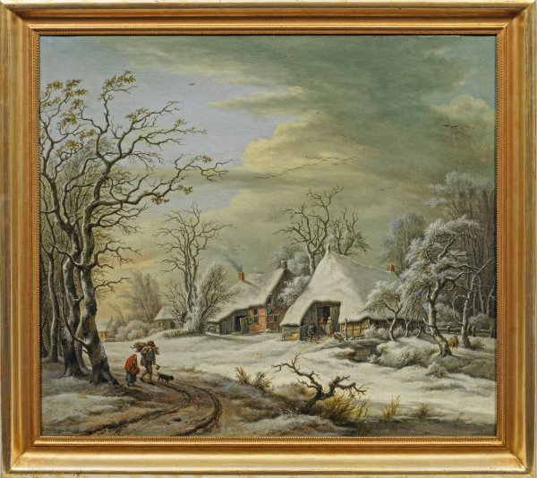 Blick auf ein tief verschneites Dorf mit Fachwerkgehöften und Eichen; links im Vordergrund, vom Reisigsammeln zurückkehrend, eine alte Frau und ein junger Mann mit Hund; rechts vor einem Bauernhauseingang drei weitere Figuren. Atmosphärisch gestimmtes, seltenes Werk des jung verstorbenen Künstlers, von dem bisher kein erhaltenes Gemälde bekannt war. Jan Vuring van Drielst lernte bei seinem Stiefvater Egbert van Drielst (1745 - 1818) in Amsterdam. Die vorliegende, 1812 entstandene Winterlandschaft schließt sich in Motiv, Stil und Komposition unmittelbar an dessen Landschaften an. Öl/Lwd., doubl.; L. u. sign. u. dat. 1812. 63 cm x 72,5 cm. Rahmen.