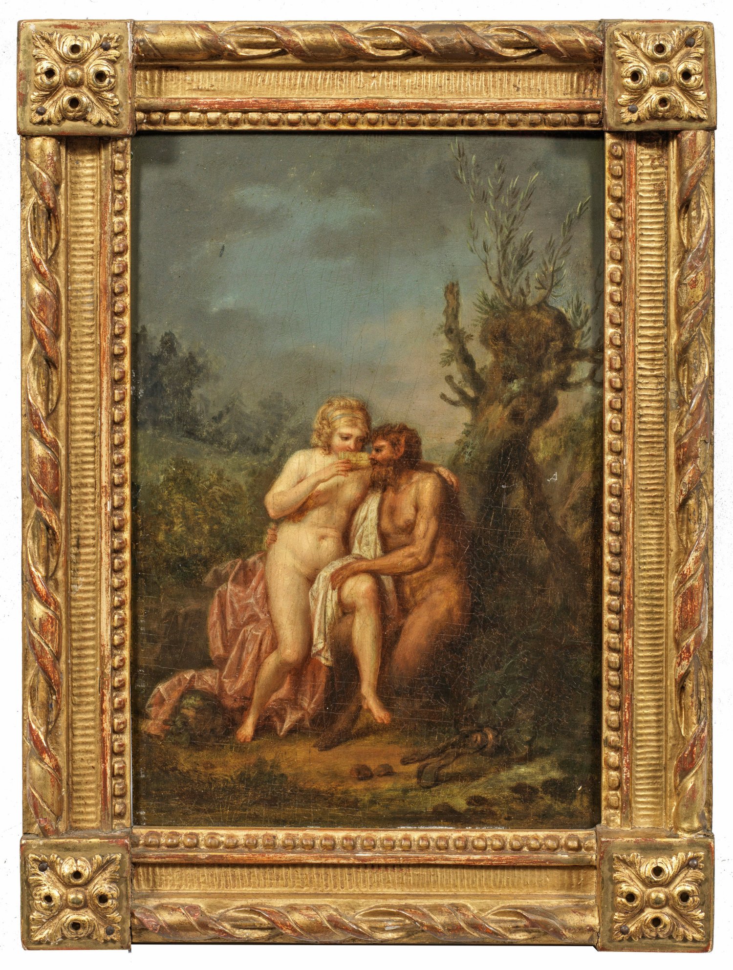 Darstellung des an einer Kopfweide rastenden Paares in einer erotischen Szene, die Nymphe als Akt, mit der rechten Hand eine Panflöte haltend. In fein lasierender Malerei ausgeführtes Kabinettbild. Schall, der von Boucher und Fragonard beinflusst war, schuf neben galanten Genrebildern und Damenbildnissen auch zahlreiche Aktbilder sowie amouröse und frivol-erotische Darstellungen. Diese entstanden teilw. während seiner Tätigkeit am Hof des Pfalzgrafen Christian IV. zu Zweibrücken für dessen "Geheimes Museum". Öl/Mahagonitafel. 27 cm x 18,7 cm. Louis XVI-Rahmen.
