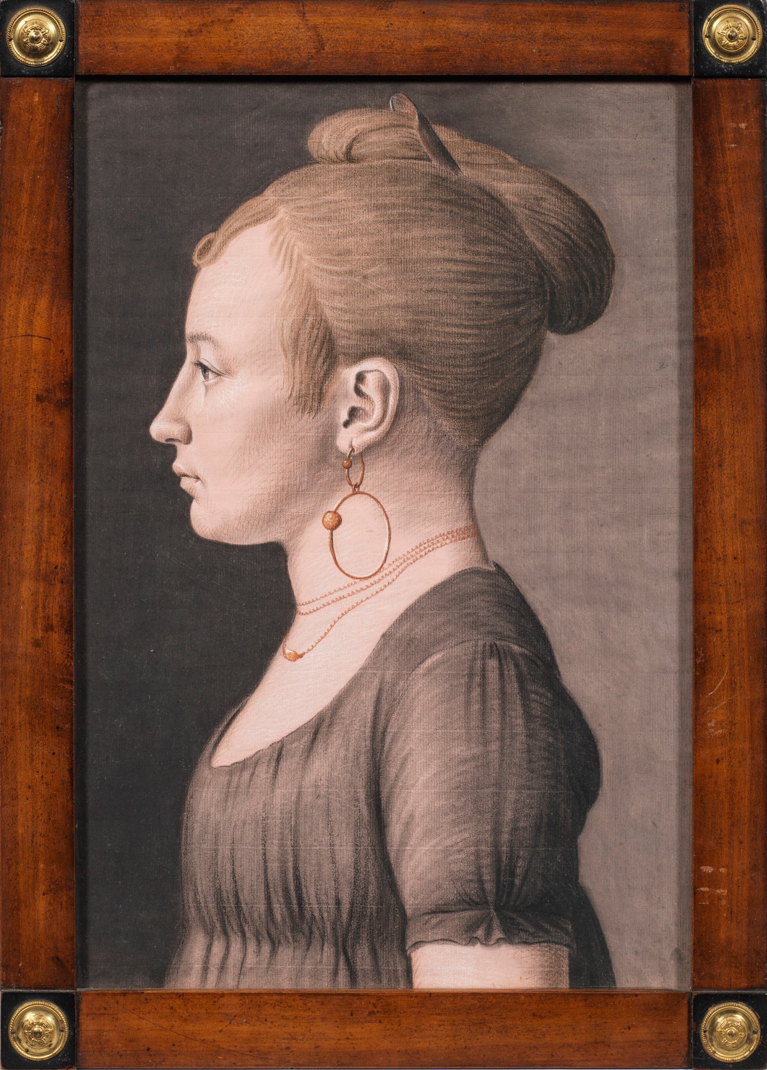 Mit hochgestecktem Haar und Goldschmuck geschilderte junge Frau. Ausdrucksvoll charakterisierendes Porträt im Profil mit subtiler Modellierung des Gesichts. Mischtechnik (schwarze, weiße u. farbige Kreide sowie Gouache)/Papier. Ca. 39 cm x 27 cm. Wohl Original-Rahmen.