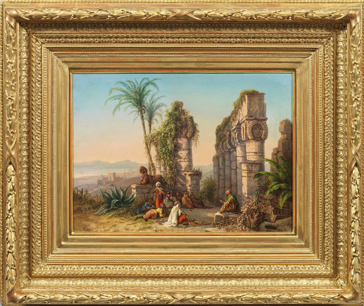 Spätromantische, orientalische Ideallandschaft in koloristisch subtil nuanciertem, warmem Abendlicht. Geschildert wird von Alt ein fantasiereiches, mit südlichen Pflanzen und Palmen bewachsenes Ruinencappriccio mit archaischen Säulen und einer Sphinx, im Vordergrund erzählt ein sitzender Araber einer Runde von faszinierten Zuhörern eine offenbar spannende Geschichte. Seltenes, wohl einzigartiges Orientmotiv im Oeuvre des bedeutenden österreichischen Landschafts- und Vedutenmalers Jakob Alt, von dem sonst vor allem Motive aus den Gebieten der österreichisch-ungarischen Monarchie sowie seinen Nachbarländern bekannt sind. Alt bereiste Italien und hielt sich auch längere Zeit in Rom auf. Öl/Lwd.; R. u. sign. u. dat. (18)62 mit Ortsanghabe Rom. 38 cm x 52,5 cm. Rahmen.