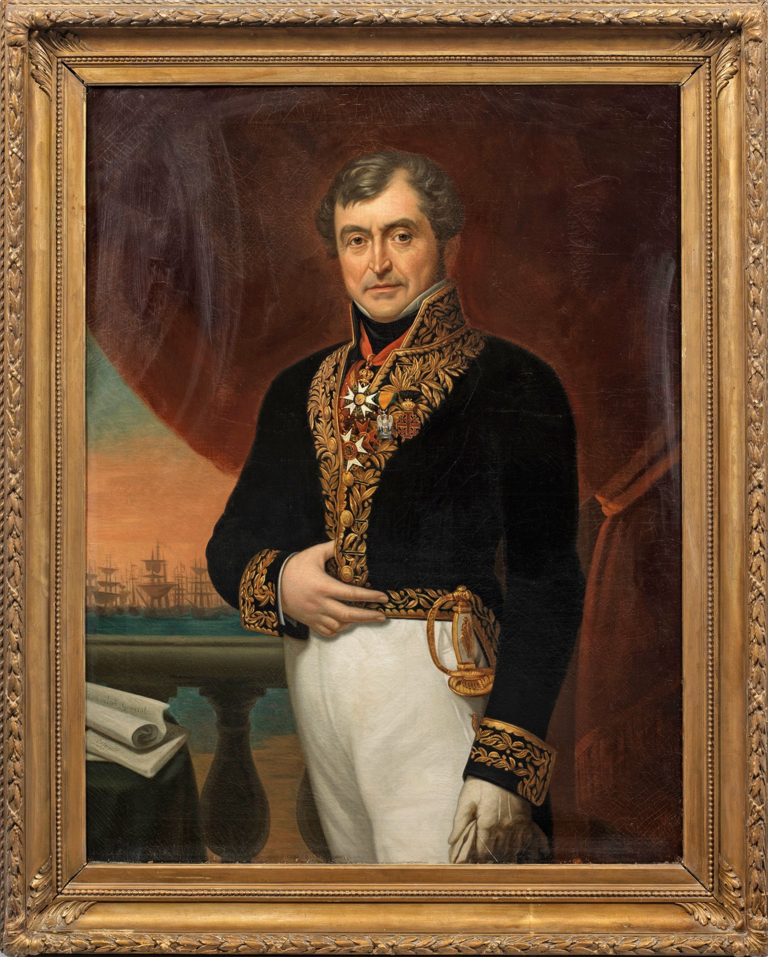 Repräsentatives, in fein lasierender Malerei ausgeführtes, lebensgroßes, künstlerisch herausragendes und feinfühlig charakterisierendes Dreiviertelporträt des bedeutenden Diplomaten, das wohl zu Antritt seines Dienstes in Alexandria (1837-1841) noch in Paris entstand. Gewandet ist Cochelet in eine seinem Rang gemäßen Uniform mit dunklem, reich goldbesticktem Gehrock. An der Brust und am Hals trägt er eine Reihe von Orden, u. a. den der französischen Ehrenlegion, den Orden vom Heiligen Grabe und den Orden der Eisernen Krone. In selbstbewusster Pose sieht Cochelet dem Betrachter en face entgegen, hinter ihm gibt ein beiseite gezogener roter Vorhang den Blick auf den Hafen von Alexandria mit Segelschiffen frei; links unten geben Schriftstücke eindeutige Hinweise, um wen es sich bei dem Dargestellten handelt "Consulat General Egypte". Öl/Lwd.; 115 cm x 90 cm. Rahmen.