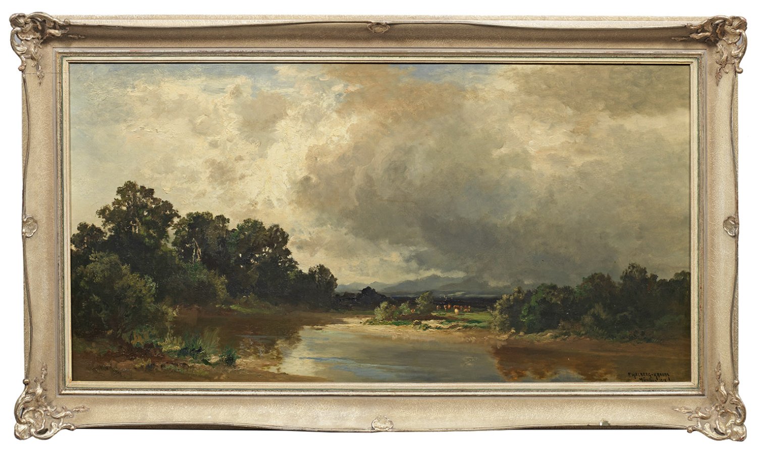 In tonigem Kolorit gemalte Landschaftsimpression. Der an der Münchner Akademie ausgebildete und ab 1908 regelmäßig im Glaspalast ausstellende Maler schilderte zumeist oberbayerische Landschaften im Wandel der Jahreszeiten, oft Gewitter- und Herbststimmungen. Öl/Lwd.; R. u. sign. mit Ortsangabe München u. dat. 1918. 54 cm x 105 cm. Rahmen.